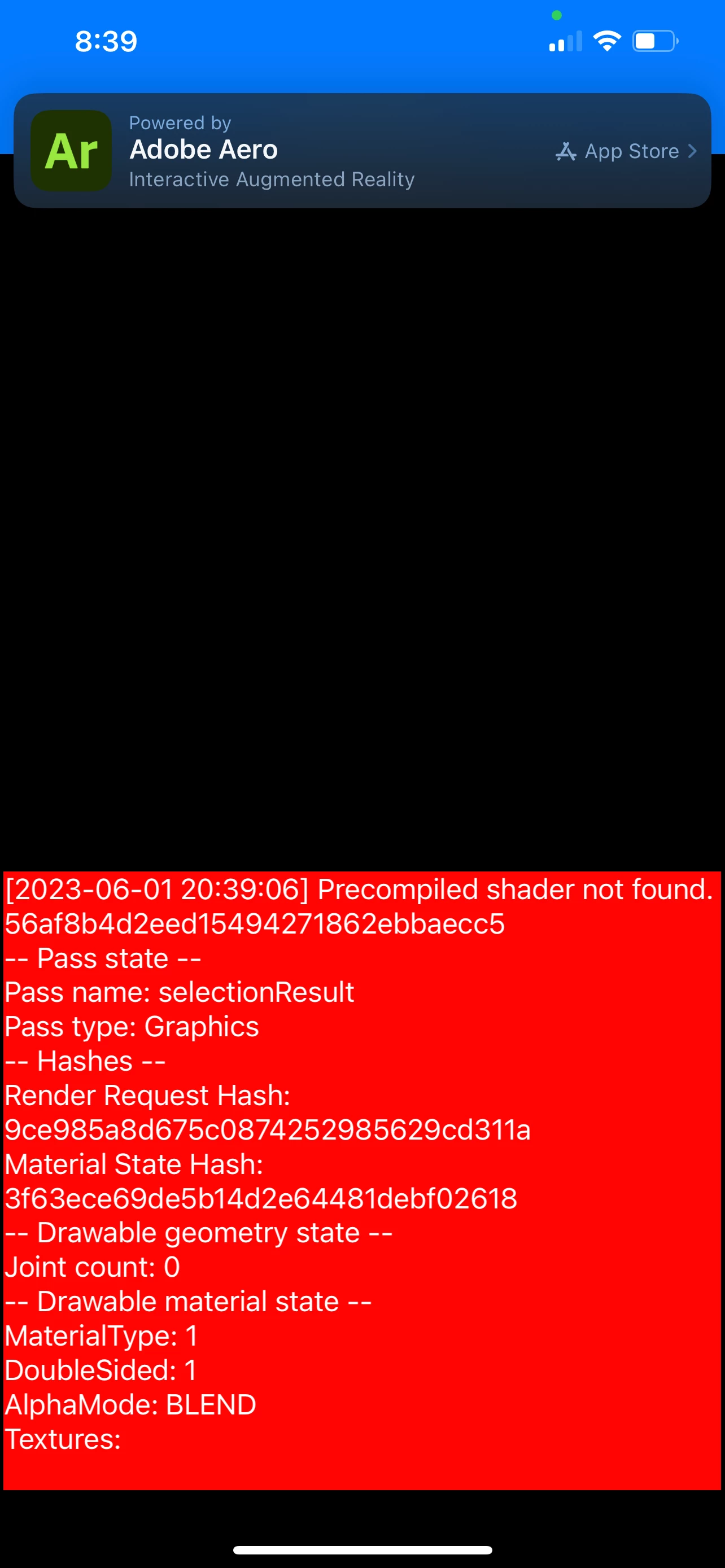 When I preview my scene in Adobe Aero (Beta) on my PC (Windows 11) it works fine, but once I turn it into a QR code and scan it with my phone. I get this red error on my phone and the screen stays black, it doesnt show my target image. My estimated project size is 55.24 MB.