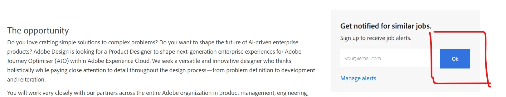 I was exploring UI/UX design opportunities on the Adobe Careers website and noticed a minor alignment issue. While scrolling the page, I found that the email input field and the button are slightly misaligned, likely due to a height inconsistency.