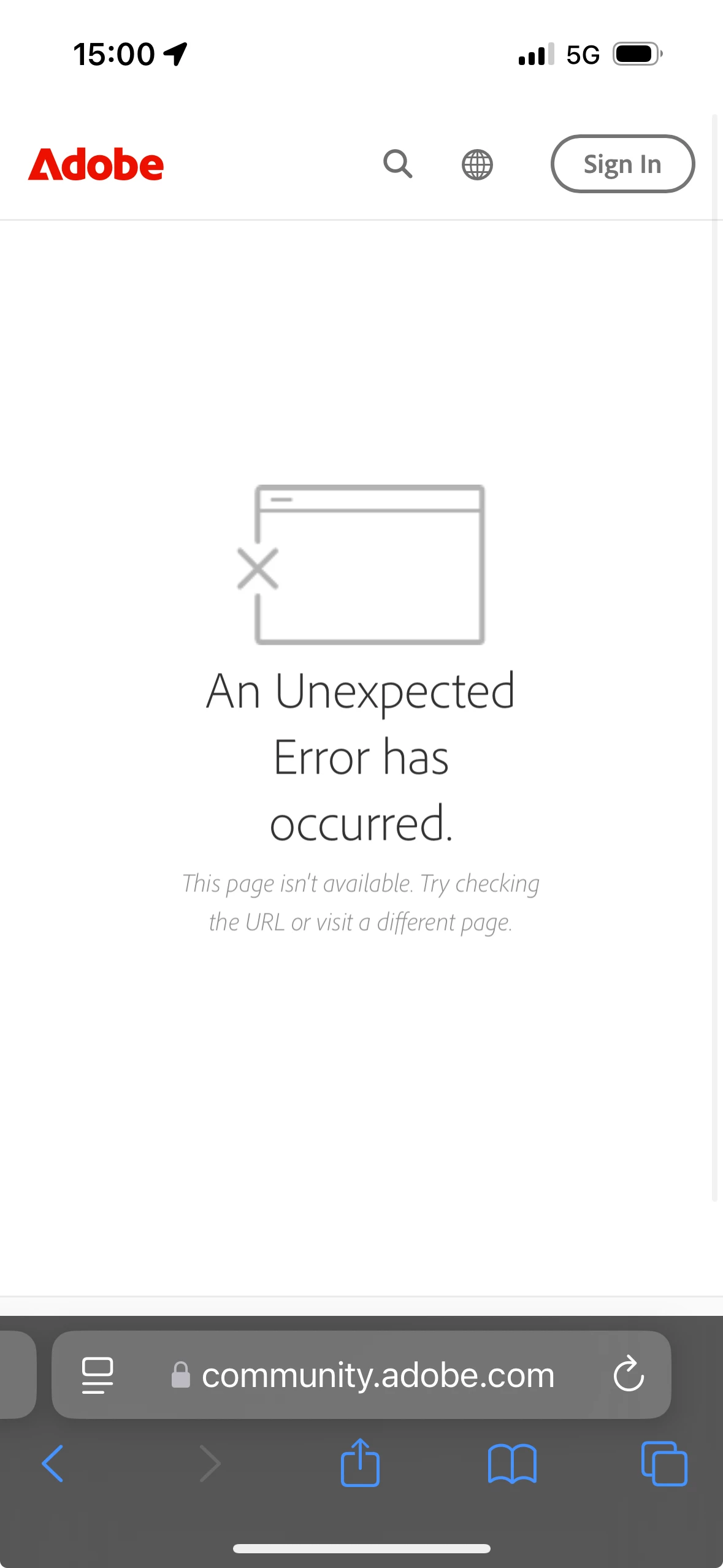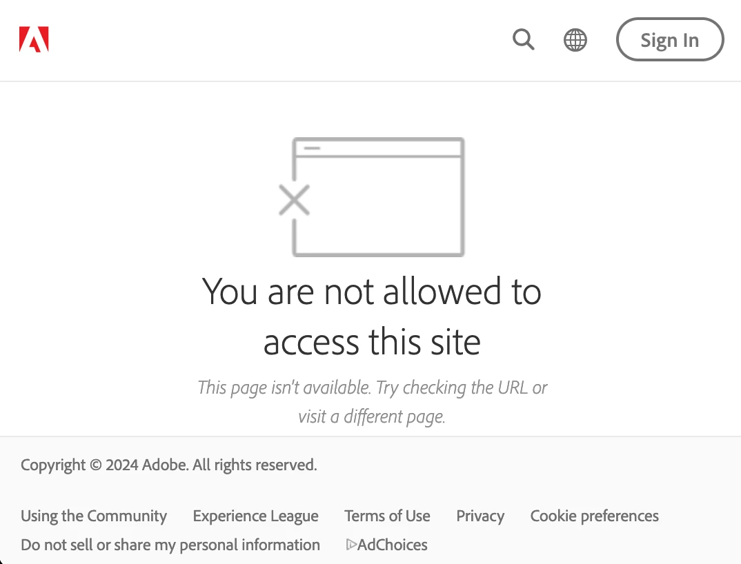 When I'm logged into my paid Adobe.com account, every page on community.adobe.com returns an error message. I am completely locked out. The site displays the message “You are not allowed to access this site,” then usually, not always, immediately redirects to another URL (https://community.adobe.com/t5/errors/FilterErrorHandlerPage),  displaying the message “An Unexpected Error has occured.”