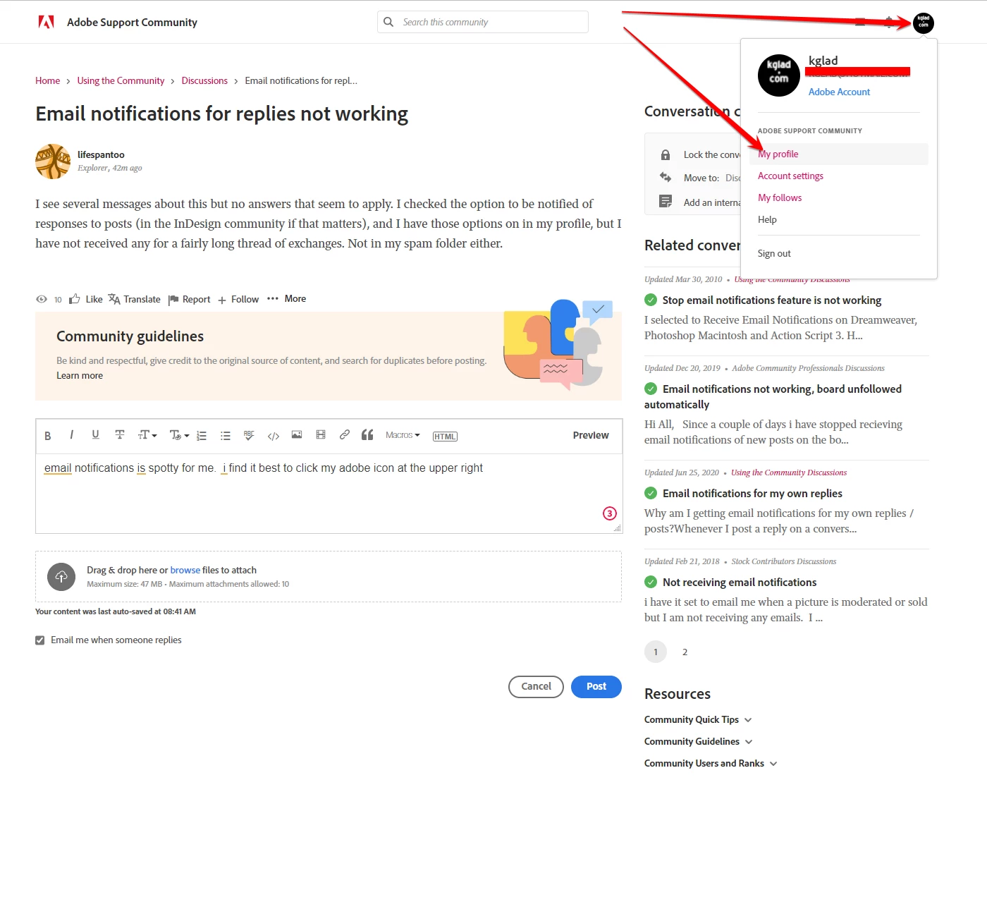 I see several messages about this but no answers that seem to apply. I checked the option to be notified of responses to posts (in the InDesign community if that matters), and I have those options on in my profile, but I have not received any for a fairly long thread of exchanges. Not in my spam folder either.