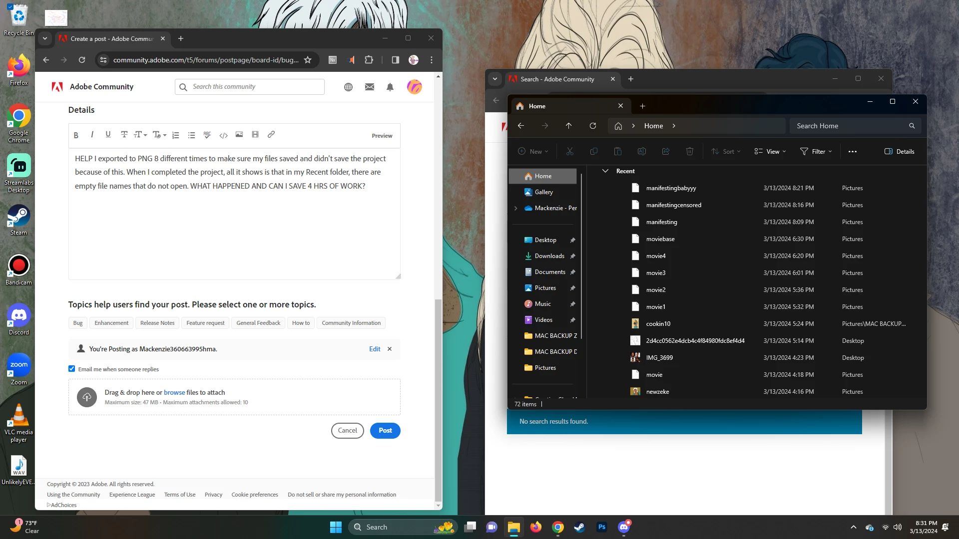 HELP I exported to PNG 8 different times to make sure my files saved and didn't save the project because of this. When I completed the project, all it shows is that in my Recent folder, there are empty file names that do not open. WHAT HAPPENED AND CAN I SAVE 4 HRS OF WORK?