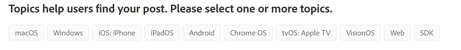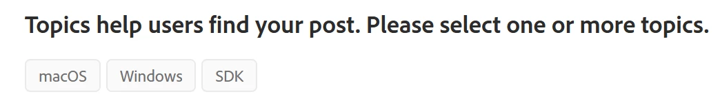 I had already selected 'windows', clicked post, then this error message came up but with no 'topics' left to pick from! See screenshot. It'd be great it Adobe outsourcing tech support to their own customers then didn't also get in the way of that.