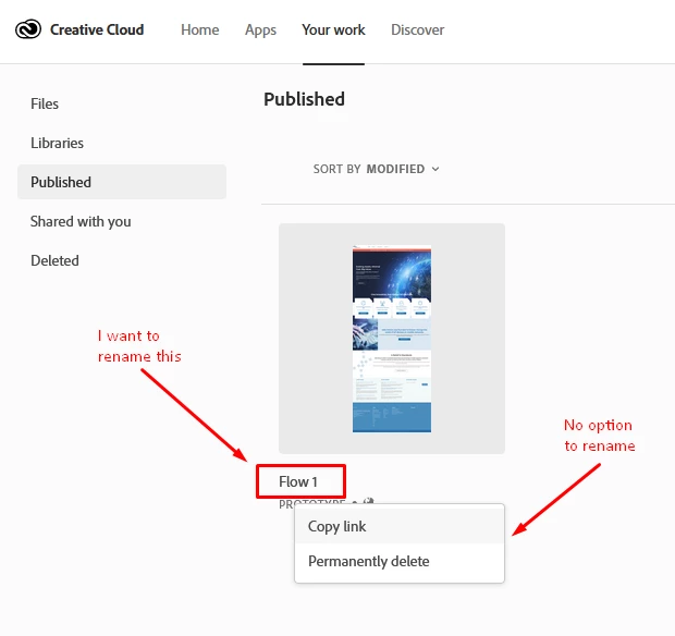 I've renamed an XD prototype from within the XD app and "shared" it but in the browser tab as well as within the shared prototype AND the CC "published" section of "Your Work" (see attached) I can't rename it there, either. Nothing I try is enabling me to simply rename this. I want a more user-friendly name/tab for stakeholders than "Flow 1". I'm very surprised to find that there is no option on the CC interface that enables file renaming? Changing the file name doesn't affect the prototypes URL so why can't it be done? Please enable us to rename files from the CC "Your Work" "Published" interface.