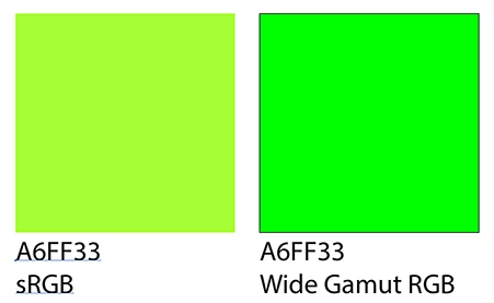 Create an RGB color R 166, G 255, B 51 in an sRGB document and add the swatch to a CC Library.