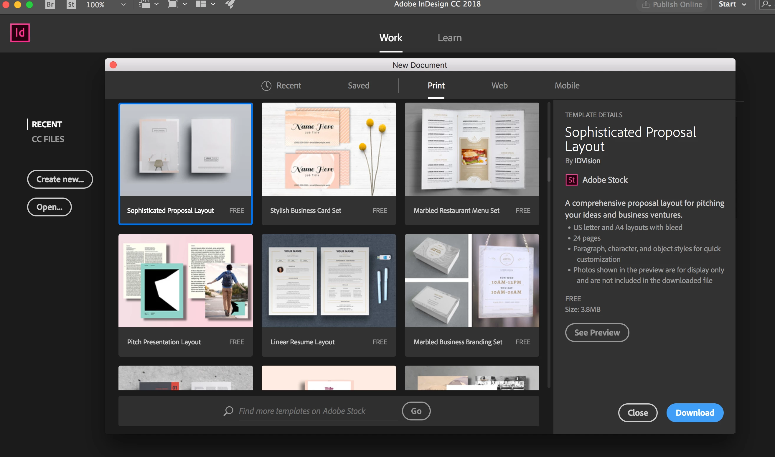 When opening a new file on any CC app the ability to download a template is available but the download button (in blue) conveniently doesn't respond to allow the template to download.