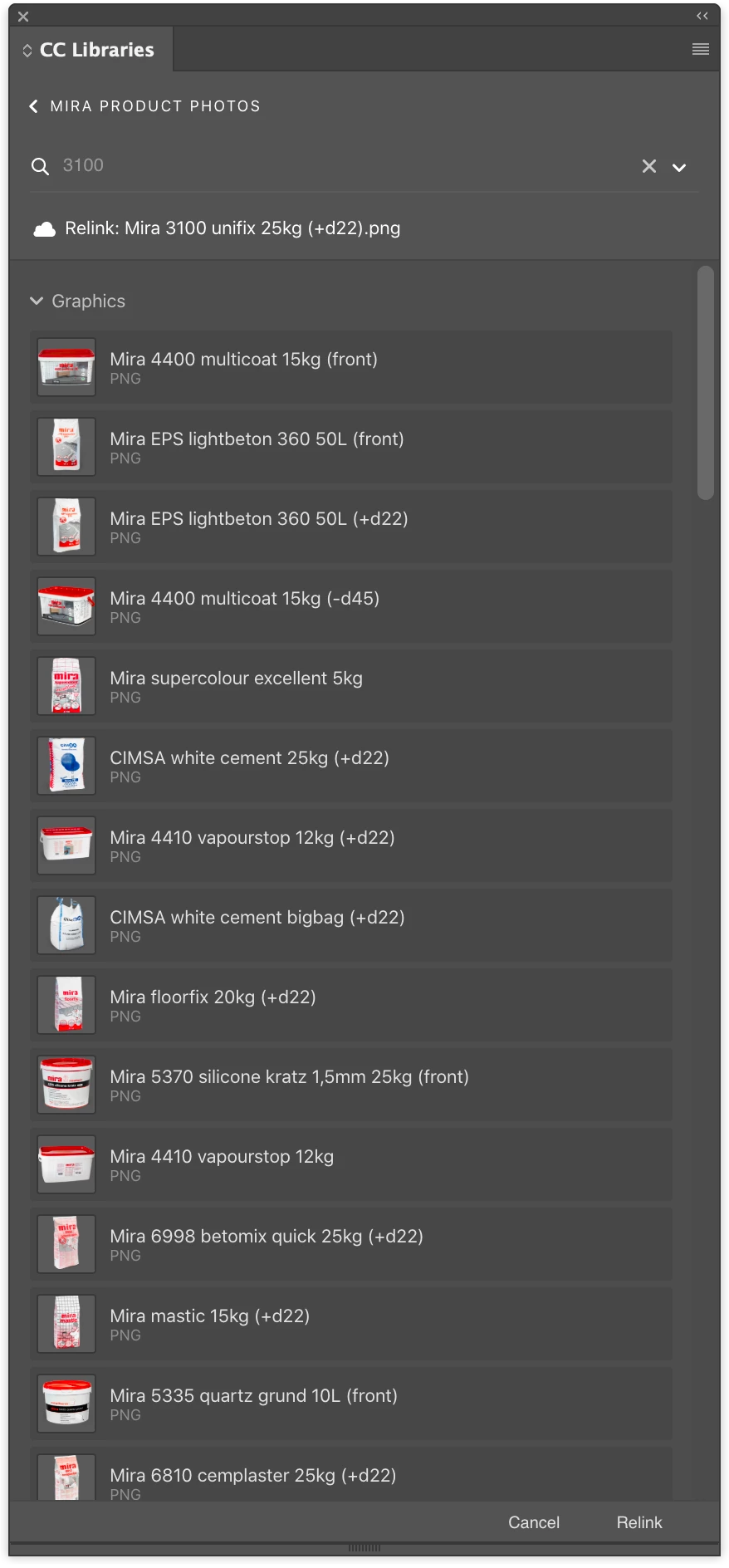 Relink is not searchable. Very hard to use if you are trying to re-link a big document to CC assets.