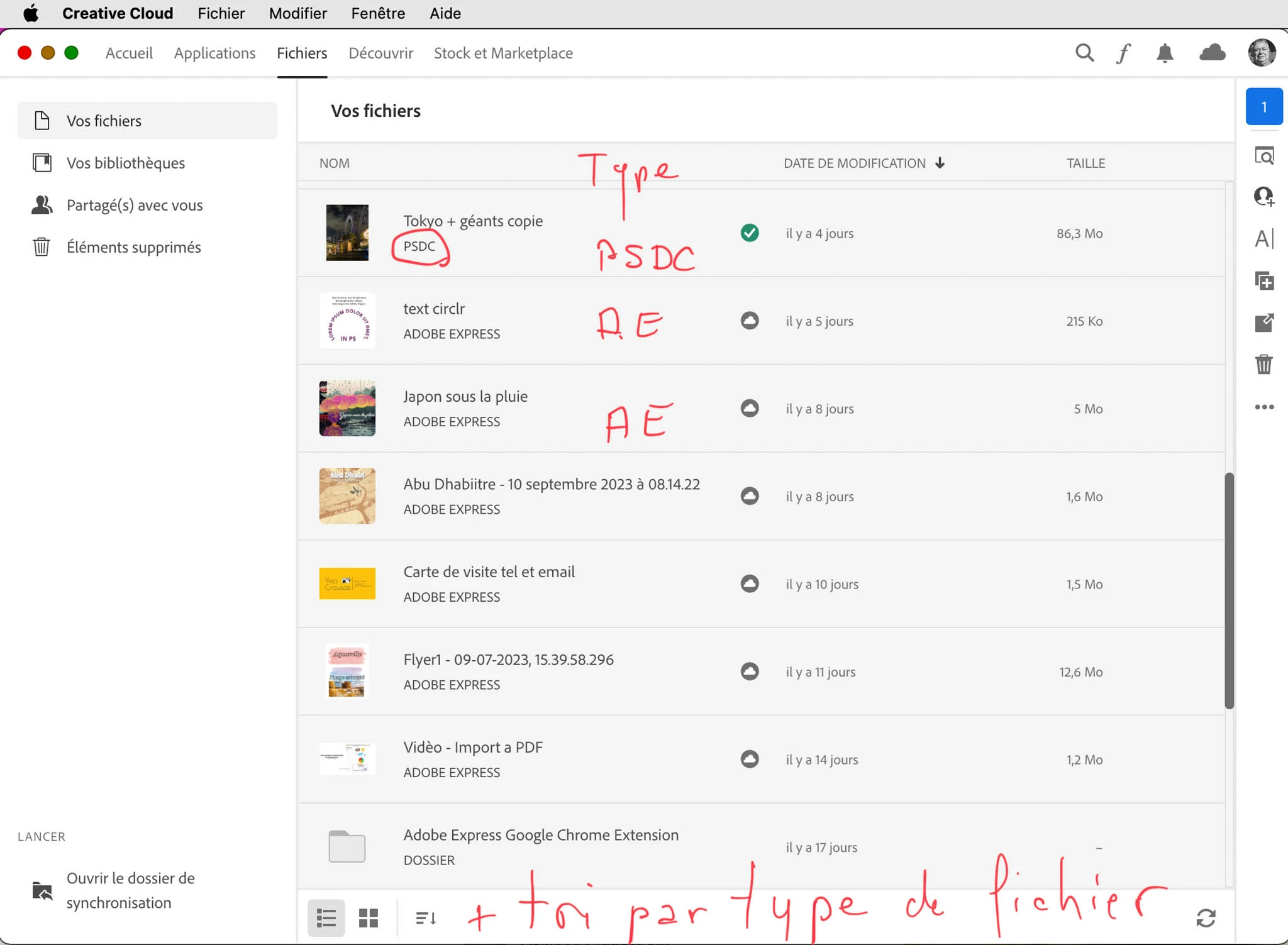 In the CreativeCloud application, Files tab, add a 'Types' column with the possibility of multiple sorting: Type and Date of creation or modification.