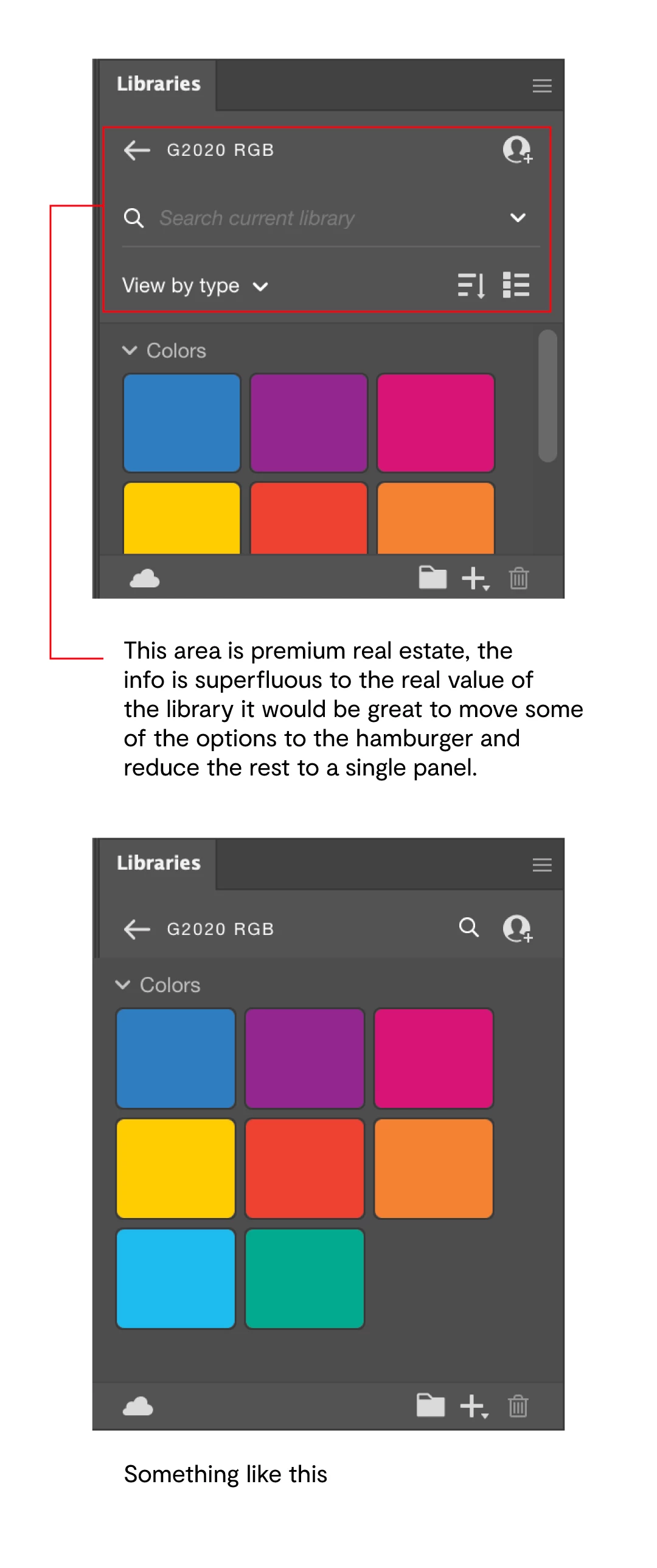 FFeedbackCommunityMemberInspiringForum|Forum|2 years agoNovember 6, 2023Open for VotingToo much infoForum|Forum|2 years agoNovember 6, 20230 replies43 viewsThe area at the top of the library panel is premium real estate, the info in it is superfluous to the real value of the library it would be great to move some of the options to the hamburger and reduce the rest to a single line.CC Libraries