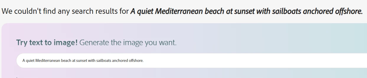 Generative AI doesn't have the quality yet, so I'm not going to waste time with text-to-image, but if I could describe what I'm looking for in the same way someone might write a prompt, and a Sensei-powered algorithm could surface the non-AI images or illustrations that fit... boy, would that save time! Why can't I search for "A quiet Mediterranean beach at sunset with sailboats anchored offshore."?
