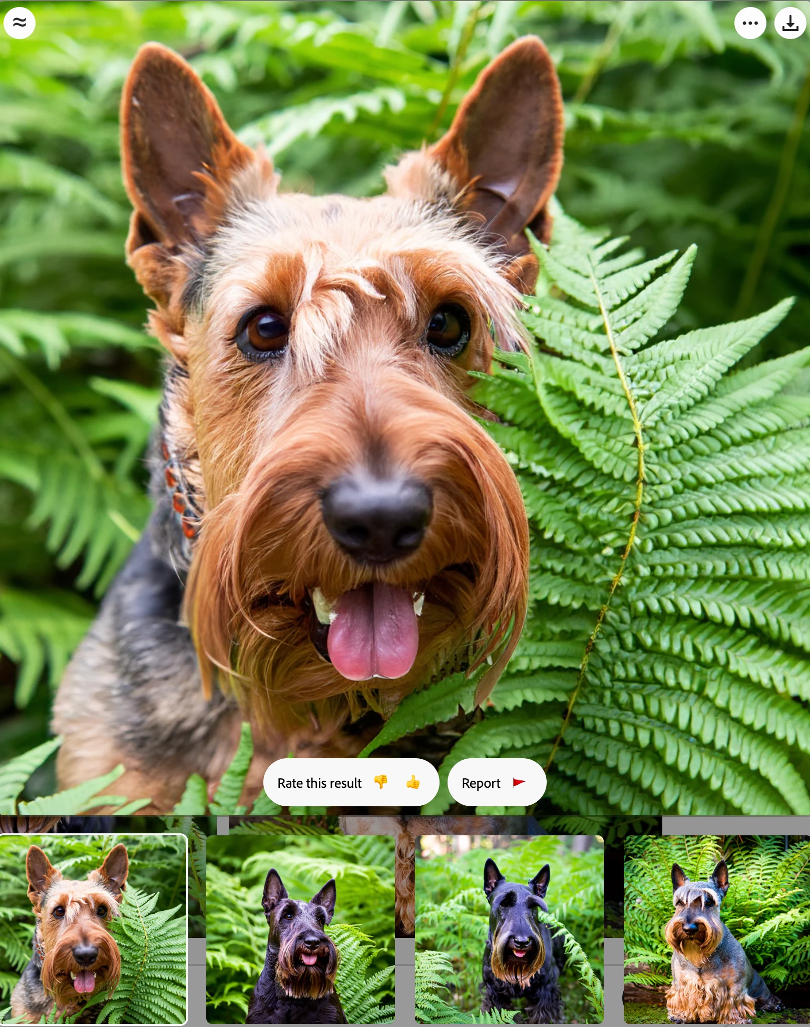 It would be wonderful to have the ability to choose one primary image from a group of four and then have the flexibility to make modifications to that particular image. These modifications could include adjustments to color, focus, blur, changing the person or object, or altering background elements, etc. This process would generate a new set of results and include the original image selected. For instance, in the image provided, the first dog is perfect, but it would be great to change only the color of its fur or the background.