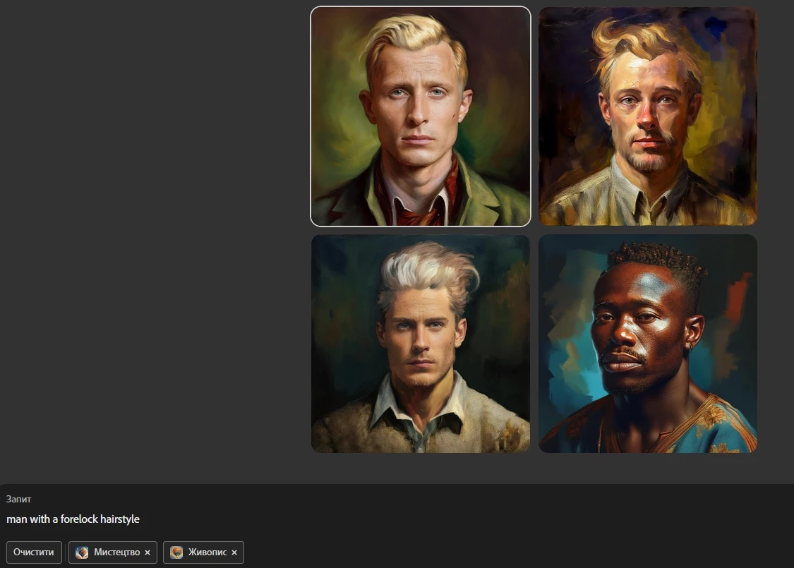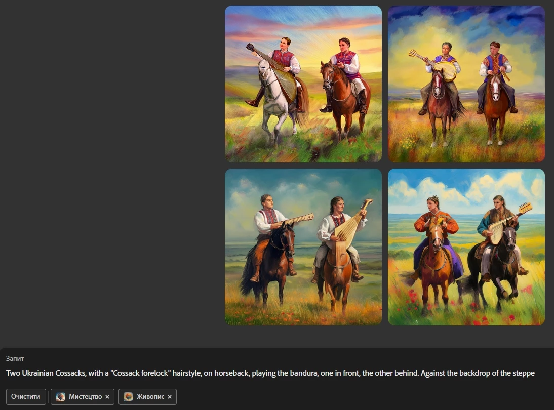 AI Firefly does not know how to depict a "forelock" or "Cossack forelock" hairstyle and Cossack clot. I wanted to get the result "Two Ukrainian Cossacks, with forelocks on their heads, on horses, playing the bandura. One in front, the other behind. Against the backdrop of the steppe", but I did not get the desired result, even with the request "man with forelock".