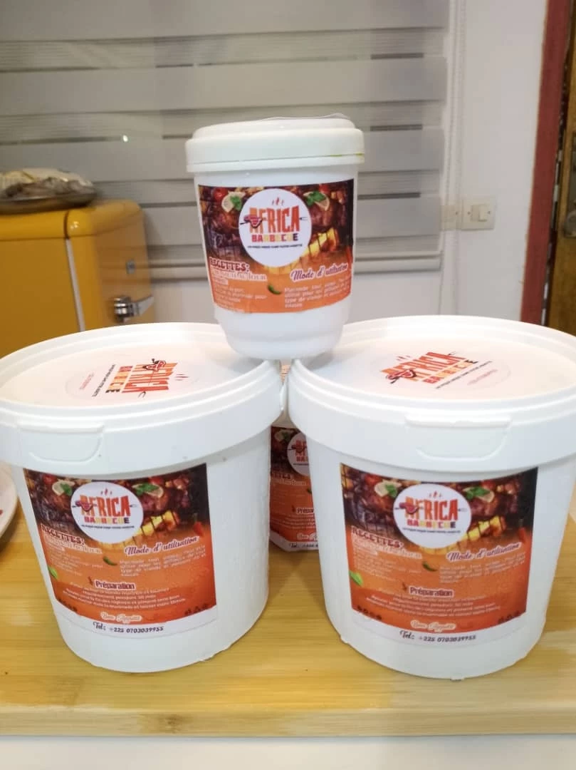 Une assiette de tagliatelles dorées nappées d'une sauce crémeuse et parsemées de persil frais. Crevettes grillées, poulet tendre, lardons croustillants et champignons sautés garnissent le plat. La sauce, subtilement épicée grâce à la marinade Africa Barbecue, est enrichie de fromage emmental fondu. Un pot de marinade ouvert et des couverts en argent complètent la scène sur une table rustique. La lumière chaude met en valeur les couleurs et textures, invitant à la dégustation.