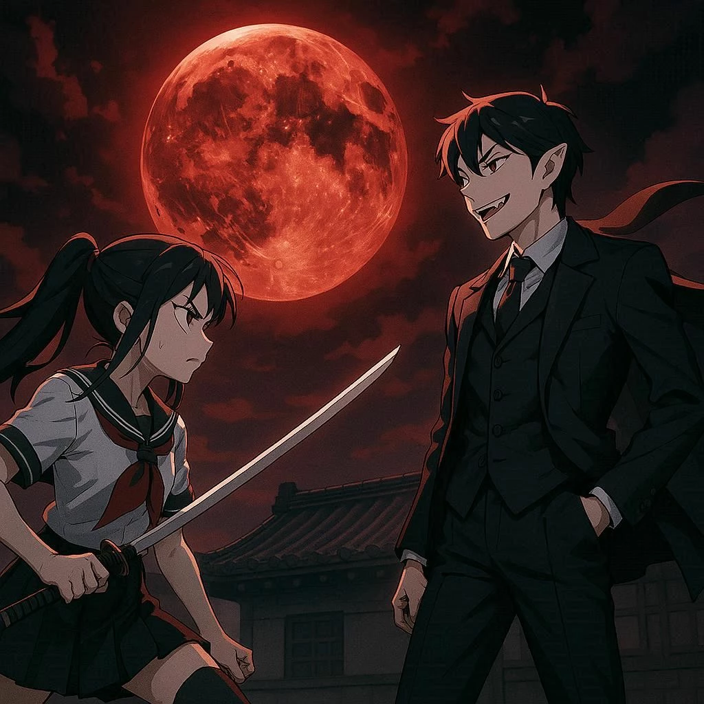 "imagen de una escena dramática estilo anime noche de eclipse lunar, plano general, en un ángulo ligeramente en contrapicado. enfrentamiento en el techo de un edificio entre una una colegiala guerrera con una katana contra un chico de su edad vampiro vestido de traje elegante estilo mafioso. mientras ella está molesta, él sonríe con una ligera sobervia"