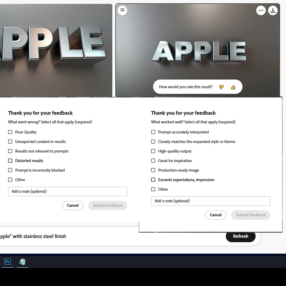 I wish there were more than a binary response to images created in firefly. Thumbs up/down is too limiting. Sometimes an image is mostly great, but could use some tweaking. I'd love to have a "thumbs up, but" option. It could even be a thumbs up, thumb sideways, thumbs down!