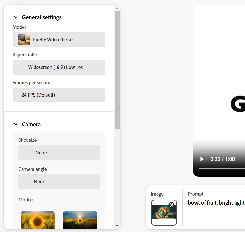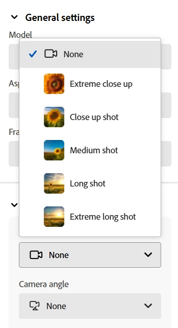 Firefly Video 'Shot size' and 'Camera angle' with reference image
