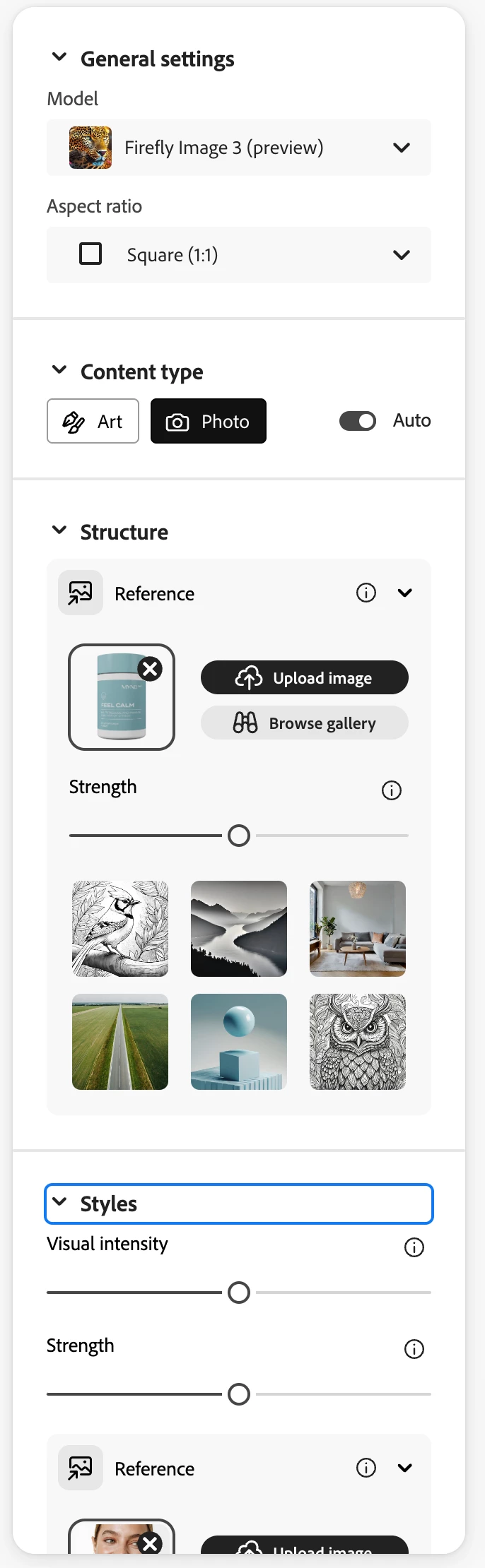 I woul dlove to view the General Settings, Content Type, Structure, and Styles available for the first attempt at Generative Text to Image. Currently we have to use one Credit and attempt to create a Generative file. I would love to upload a reference photo first and then type in a prompt. When I only have 25 credits a month and every attempt uses a credit, I'm not going to use Firefly very often.