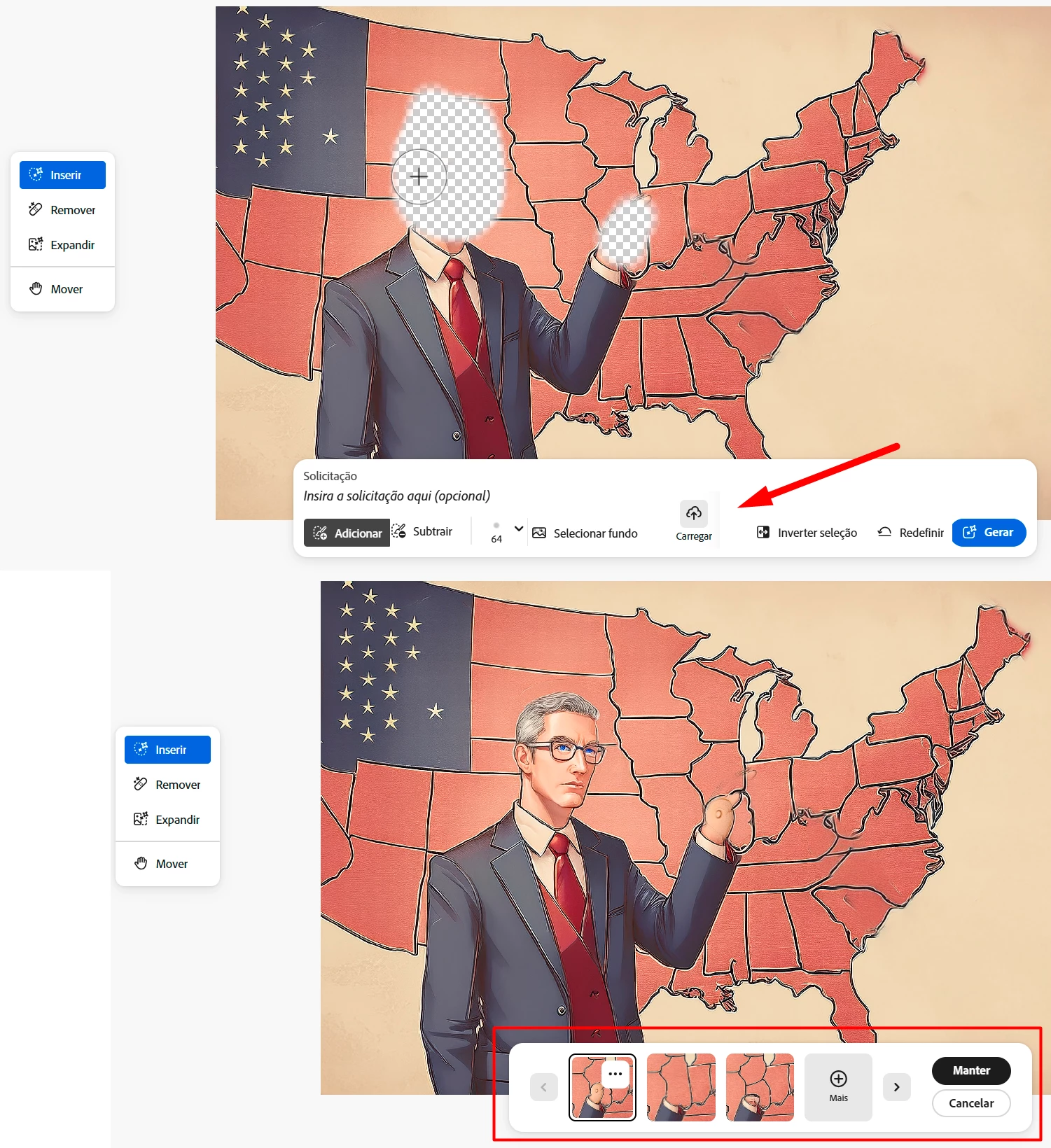 Na ferramenta inserir, pode aparecer uma opção para upload de arquivo de referência, auxiliando a IA para gerar a nova imagem ou edição de área específica.
