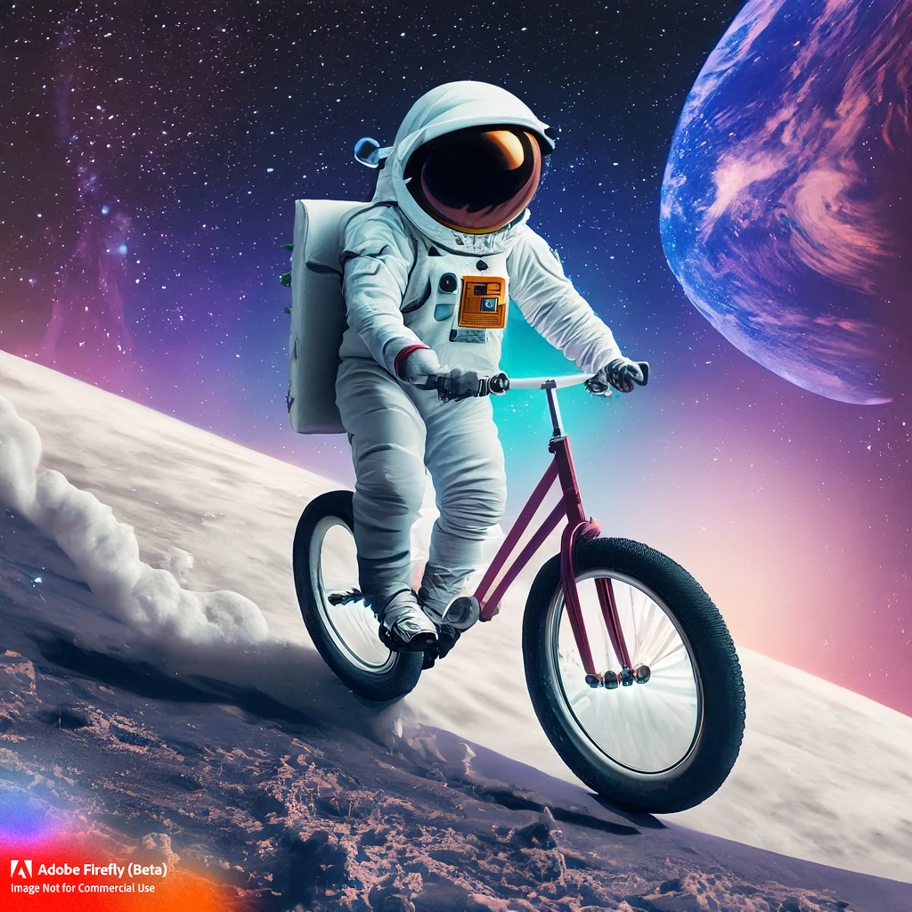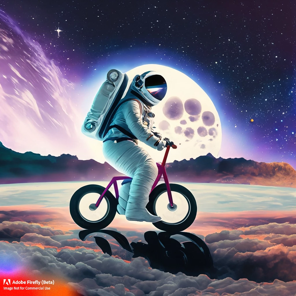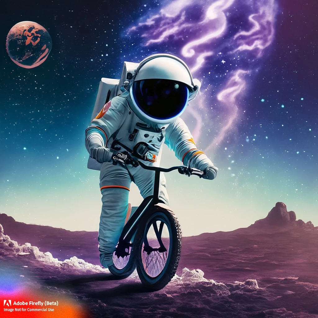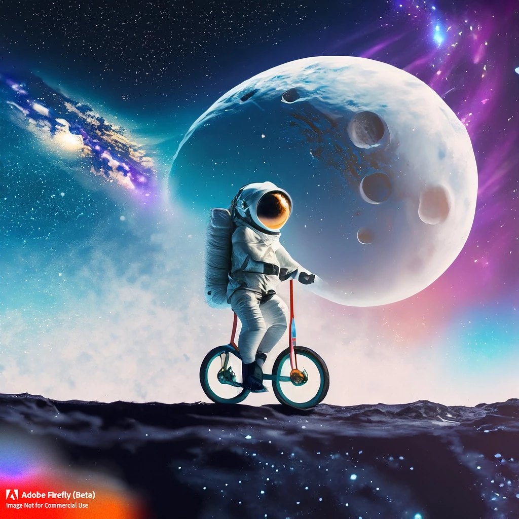 I requested "A person with space suit riding a unicycle on the moon with storm and galaxy in background."