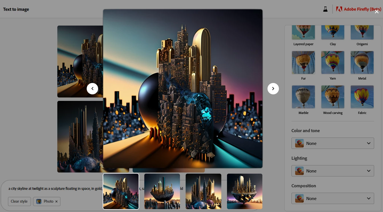 This layout for displaying a close-up of one generated image and the thumbnails of the quartet of generated images would be dramatically improved if the new display appeared over a solid background instead of appearing over the original screen. It is difficult to judge images with so much visual clutter surrounding them.