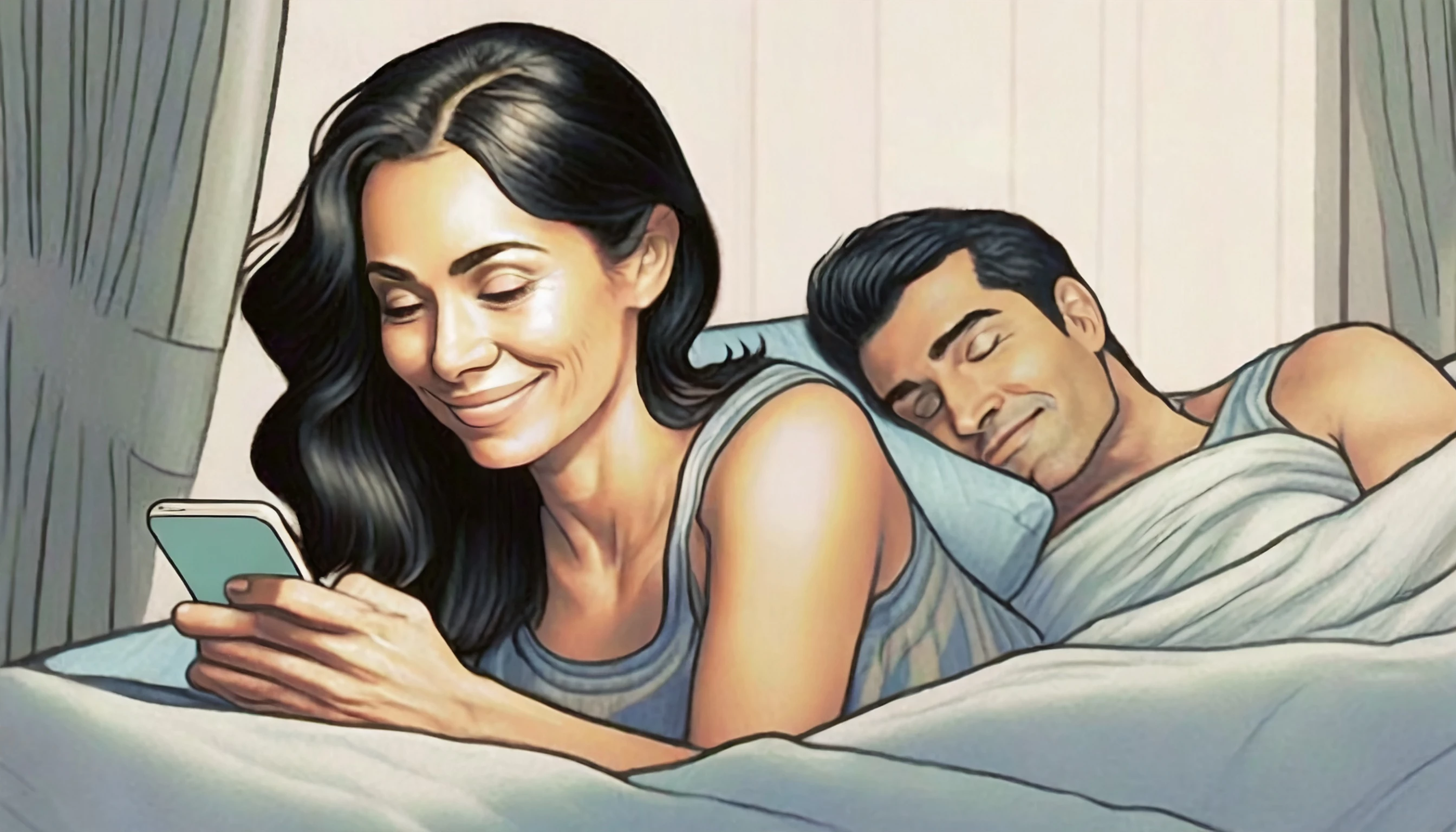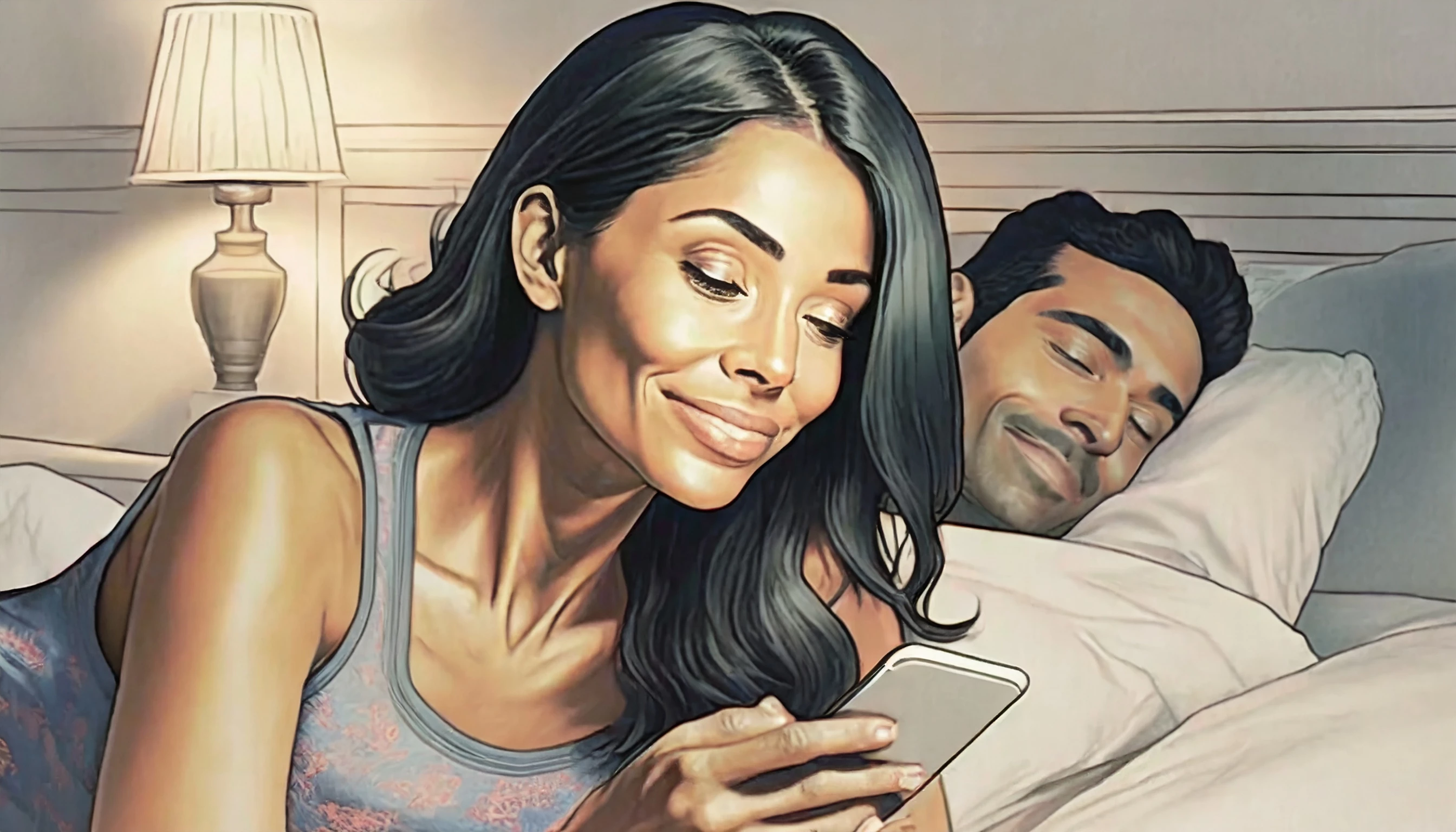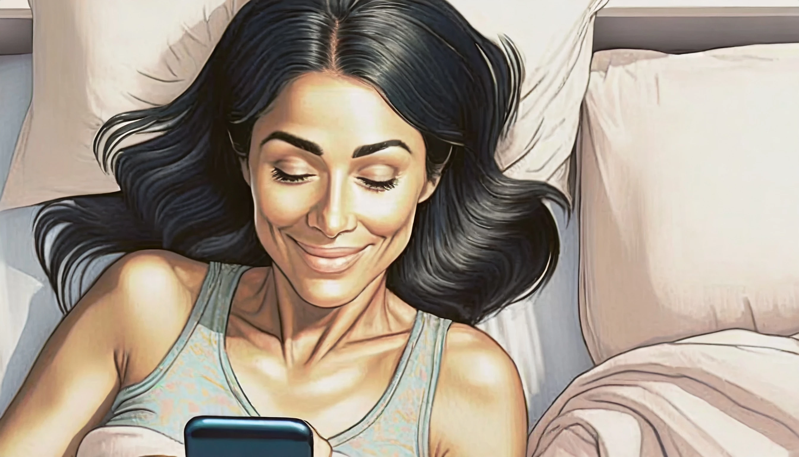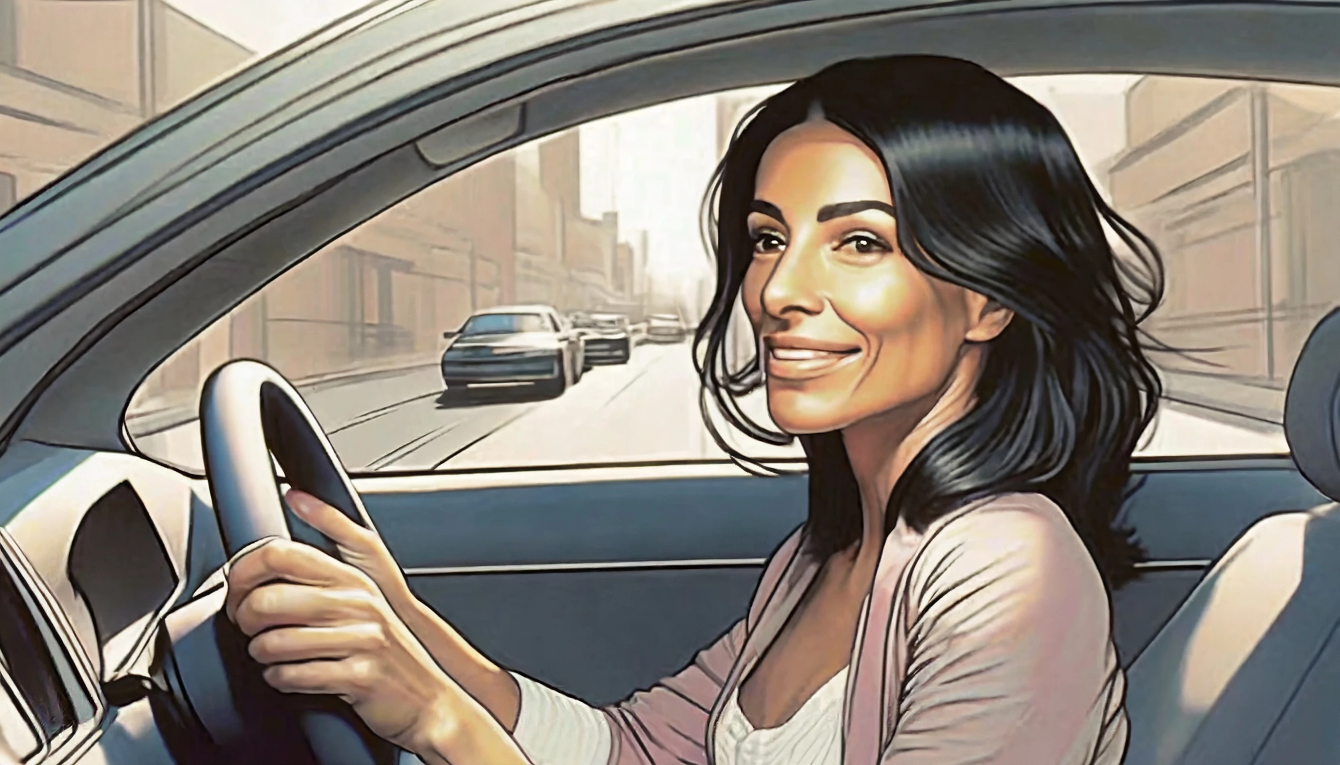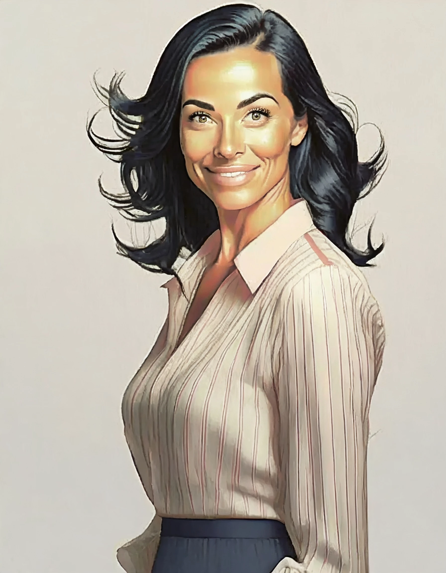 "a 40-year-old woman with tan skin, medium-length black wavy hair parted to the left, with hazel eyes and a long slender nose, with medium-thin lips"... (This gets inserted in the front of every subesquent prompt)