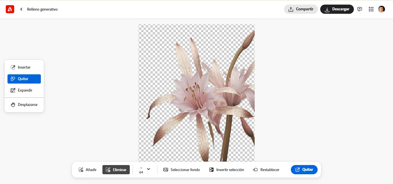 Adobe Firefly no descarga la imagen en .png fondo transparente después de haber quitado el fondo con la herramienta.