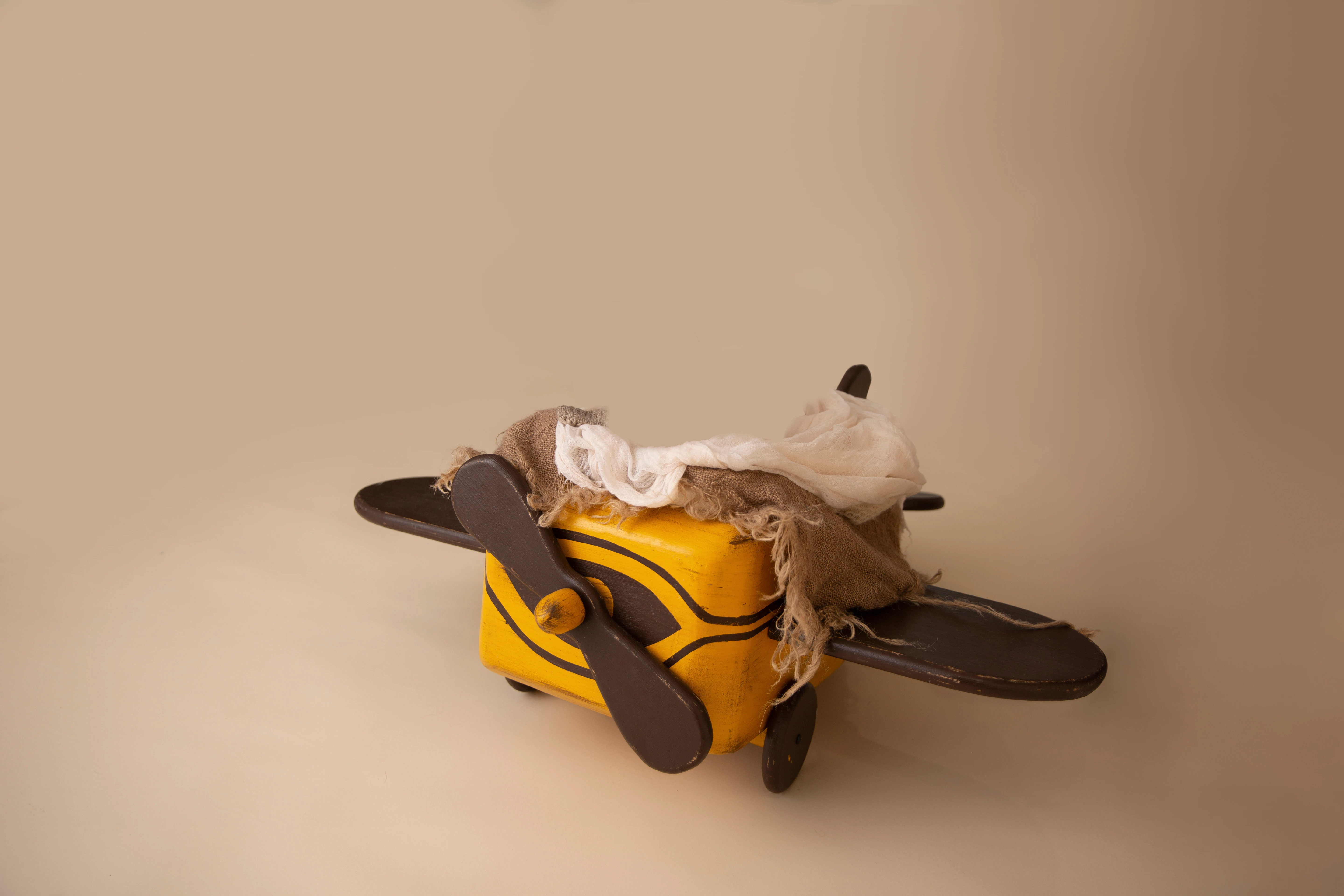 Create a delightful image of a wooden toy airplane that is perfect for use in Photoshop. The toy airplane is crafted with attention to detail, featuring smooth curves, a charming design, and a playful color scheme. The wooden texture of the airplane adds warmth and a nostalgic touch to the image.The background depicts a cozy and well-lit room, providing a comfortable setting for the toy airplane. Soft natural light streams in from a large window, casting gentle shadows and creating a welcoming atmosphere. The room is tastefully decorated with elements that complement the wooden airplane, such as soft cushions, a plush rug, and perhaps a small bookshelf filled with storybooks.The color palette is kept soft and harmonious, with muted pastel tones that add to the overall charm of the image. The focus is on creating a sense of innocence and playfulness, evoking a feeling of joy and imagination.