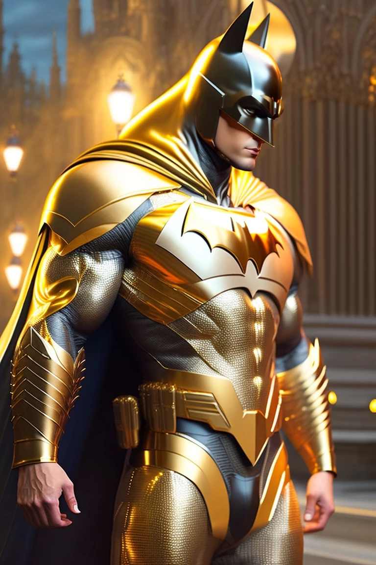Batman, wearing a sleek golden suit that glimmers in the moonlight, patrolling the Gotham City skyline, his presence radiating an air of mystique and grandeur, the golden armor providing enhanced protection and agility, while symbolizing his relentless pursuit of justice, Photography, low-key lighting emphasizing the suit's reflective properties, --ar 9:16 --v 5