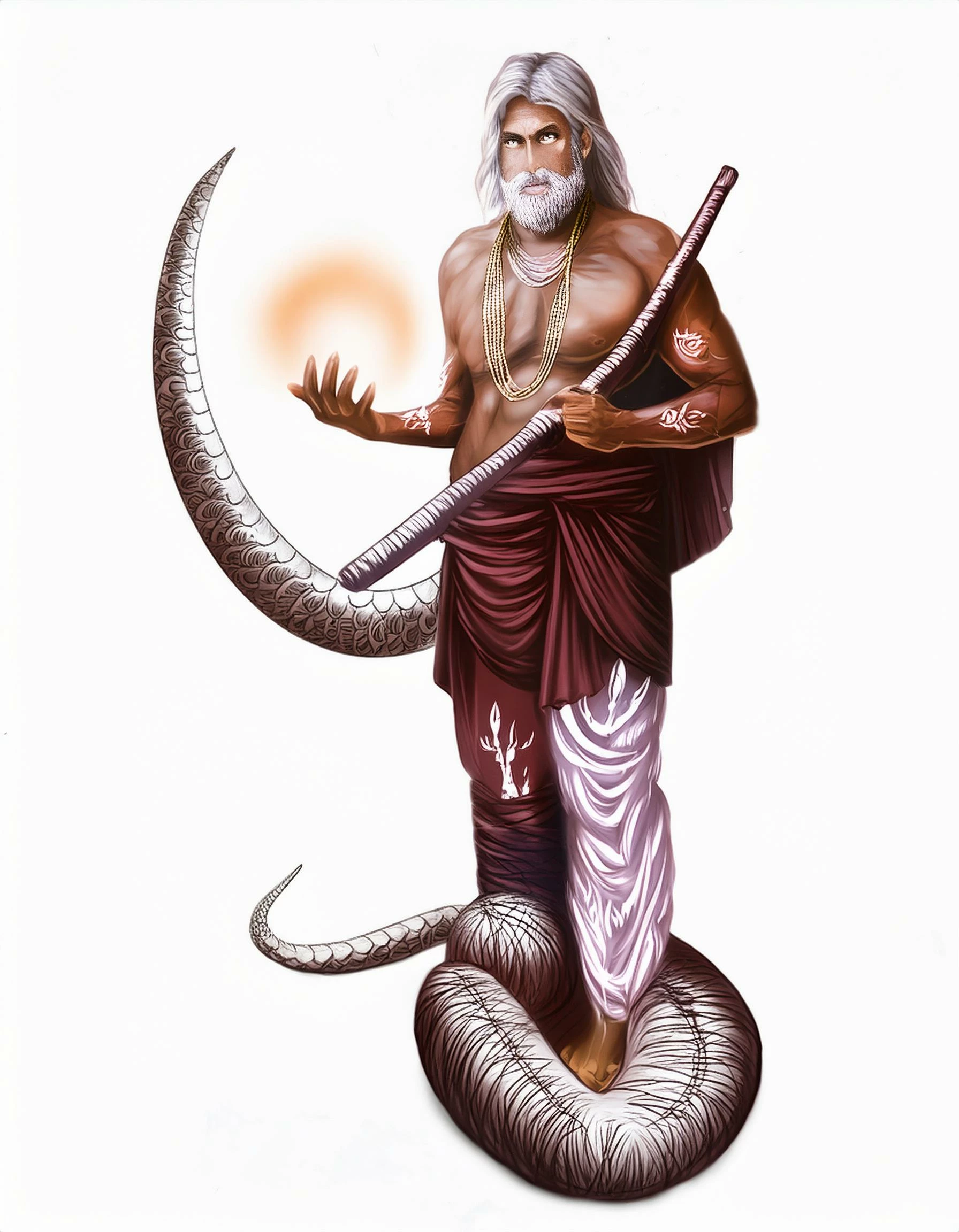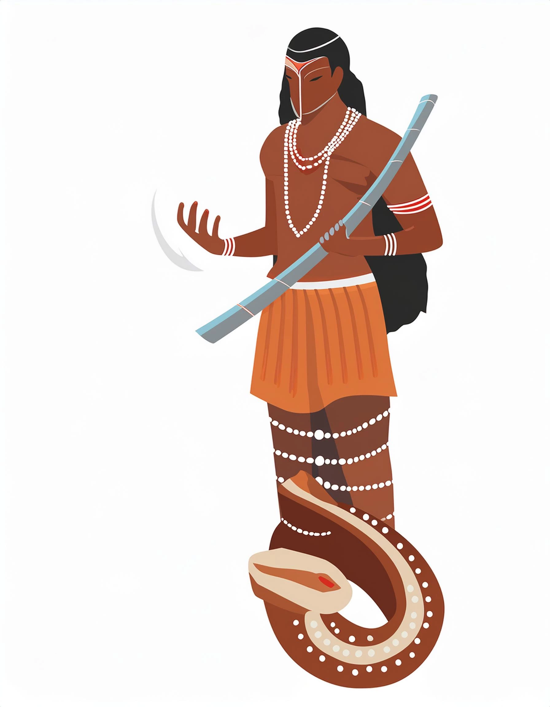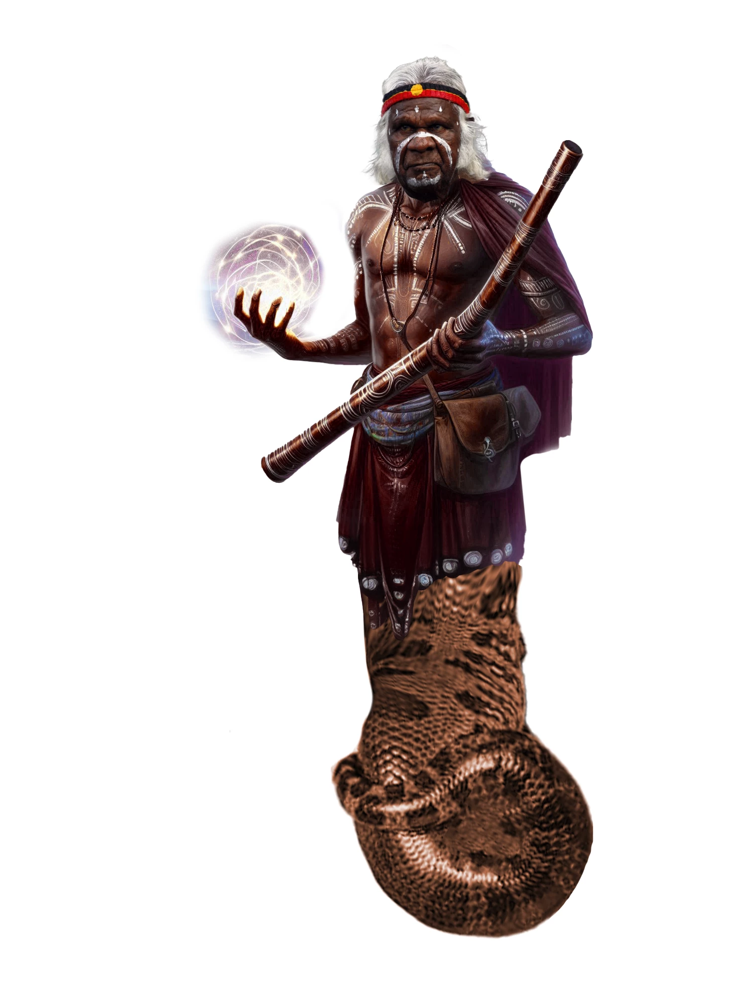 "Ein australischer Ureinwohner steht vor dem Uluru. Seine zwei Beine sind zu einer Riesenschlange zusammengewachsen. Auf seiner Haut weiße Tattoos der heiligen Regenbogenschlange der Aborigines." eingebe, dazu als Struktur dieses Image