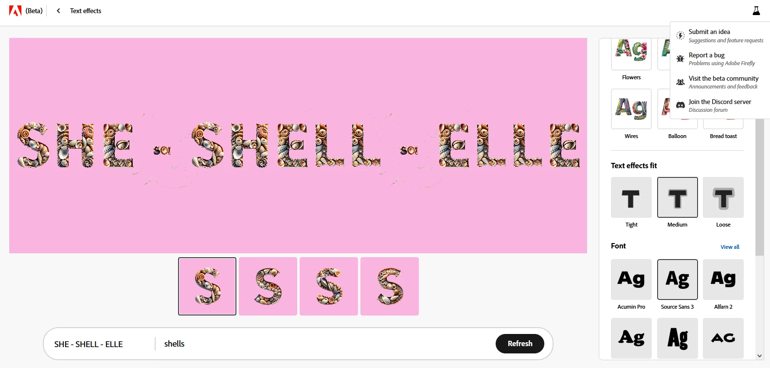 Fane DevieParticipantForum|Forum|2 years agoJune 13, 2023Open for VotingText effectsForum|Forum|2 years agoJune 13, 20230 replies111 viewsWanted to generate 3 words :- had to separate them by a dash, would rather like to write them on 3 different lines- would like to be able to change size of the words Creative Imaging