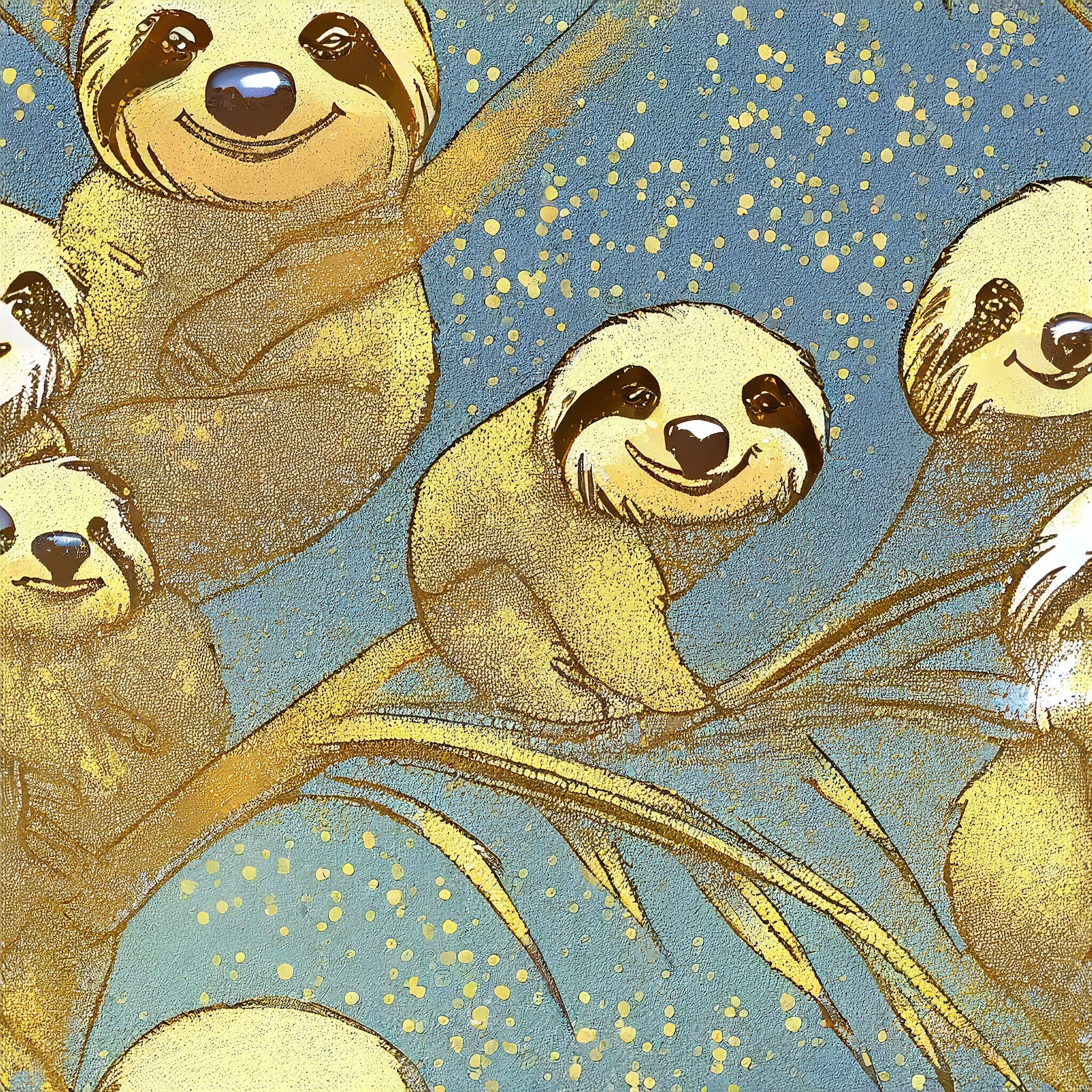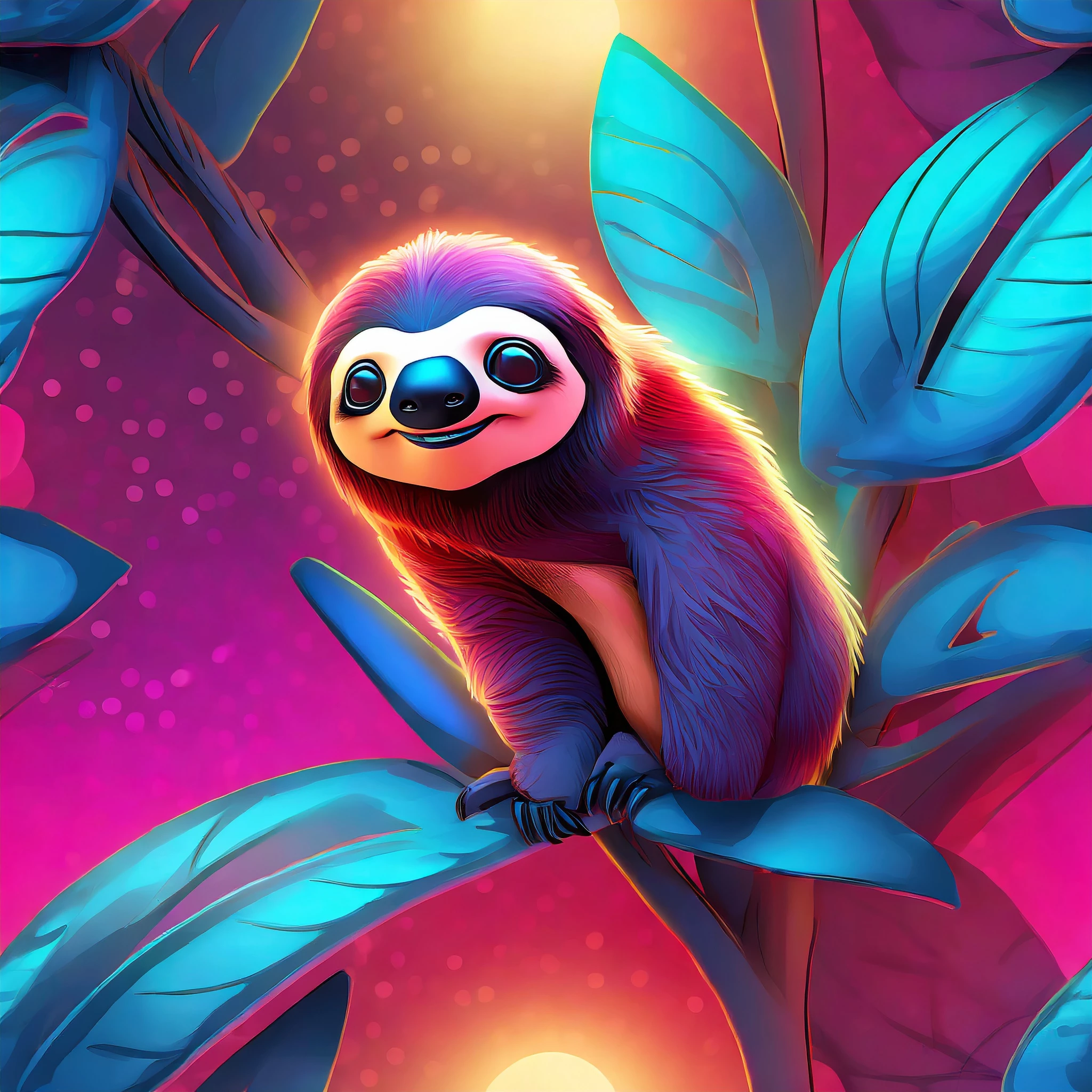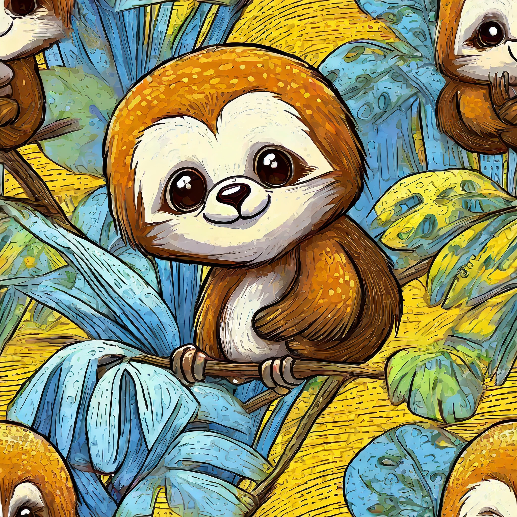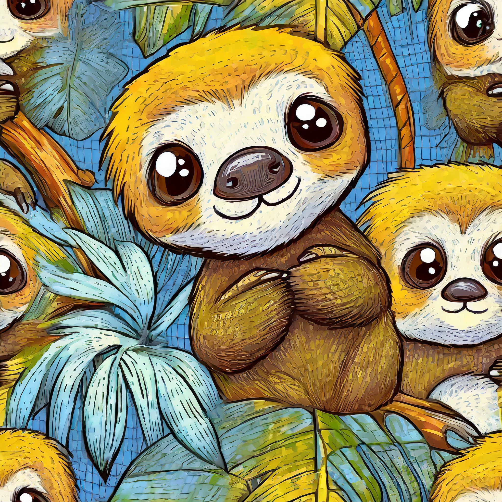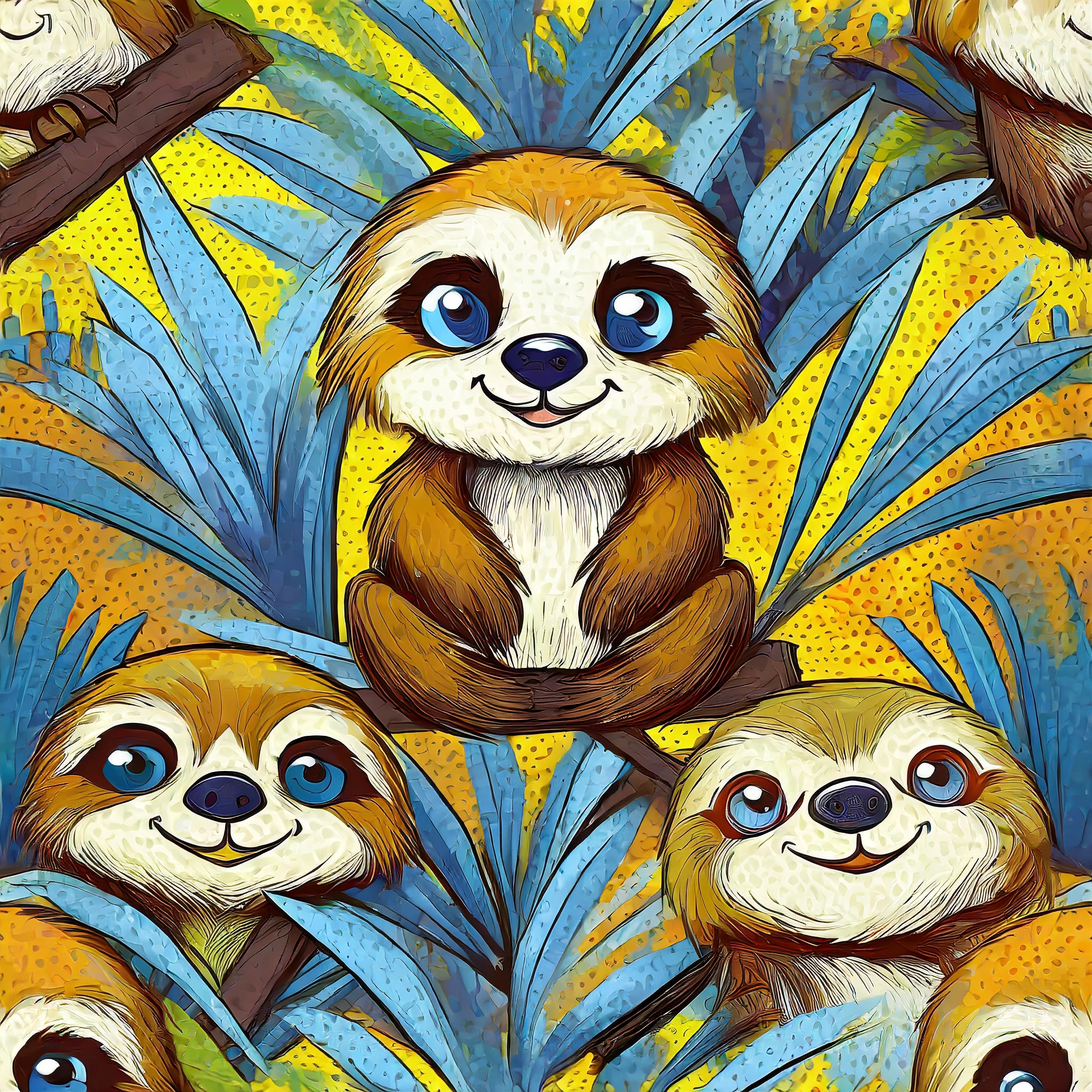 "A seamless repeating tileable pattern; cute hyper realistic looking cartoon sloths in a jungle background; for printing on fabric, wallpaper and other packaging and textiles"