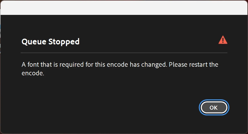 Media Encoder stopped an export two hours into rendering it because I installed a completely unrelated font. I was doing some graphic design work while letting media encoder do a final render of a video project, and then it just... stopped the encoding because I installed a font? This is ridiculous behavior - ME should give me the choice to let the render continue, because I didn't do any changes to the fonts that are actually used in the premiere project.