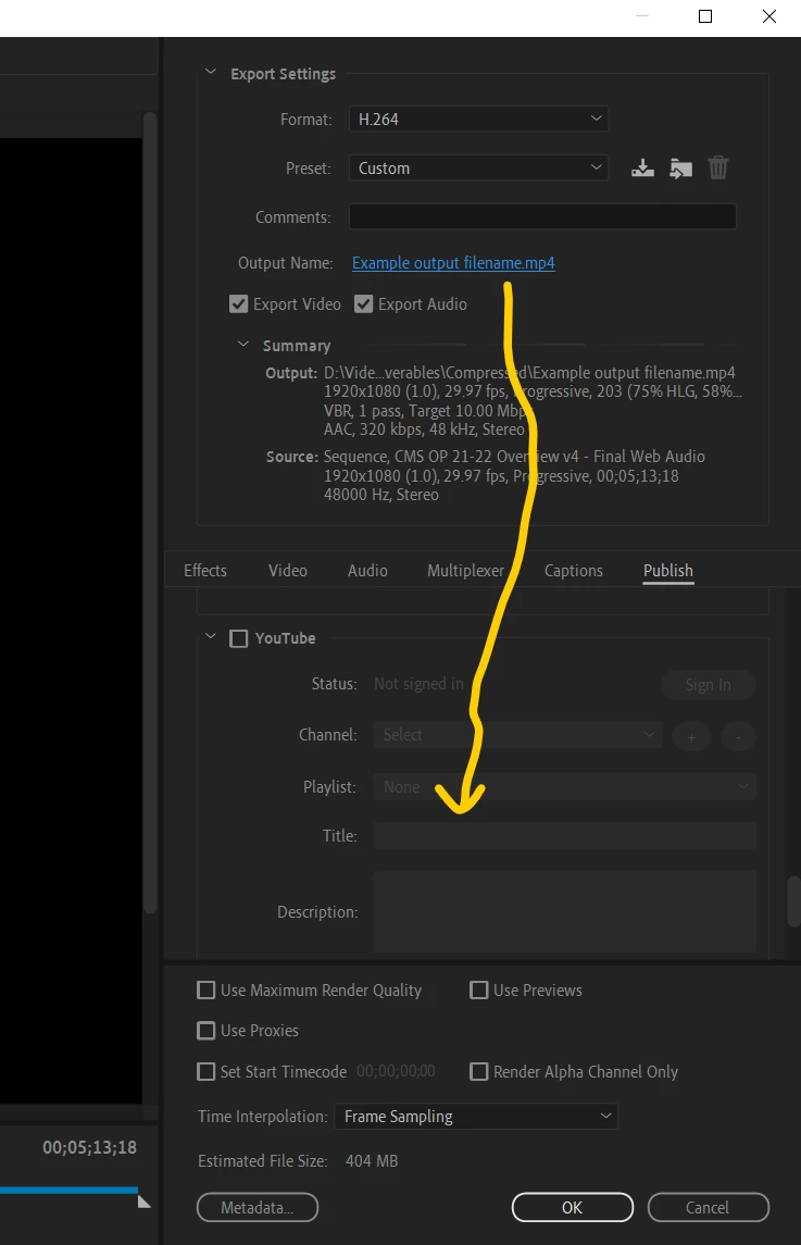 In the Export Settings Window > Publish tab > Youtube, Vimeo, Facebook and other publish options, could you auto populate the Title field with the sequence or AE comp name? Similar to how you auto populate the Output Filename with the sequence or AE comp name. The screen shot may explain it better.