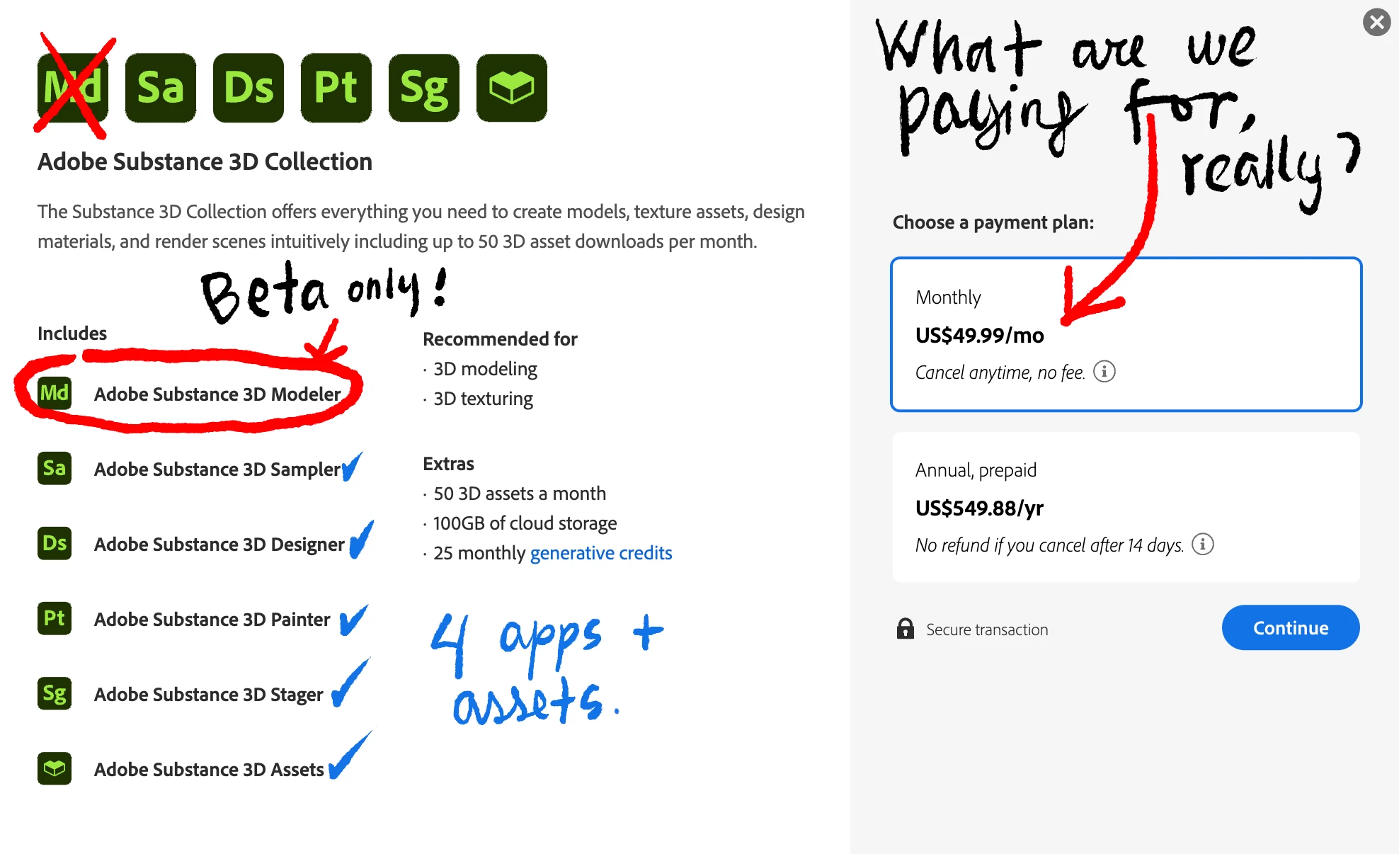 Hello. I am evaluating the pruchase of the Adobe Substance 3D Collection. For that reason, I've been installing its 5 apps... wait, well, no, 4 apps. I just found out that even though Adobe Substance 3D Modeler is shown as part of the collection it is not, quite; not yet at least. For now Adobe Substance 3D Collection is an optional install as it is stil in beta. Where is this disclosed? Somewhere in 3pt. type perhaps?
