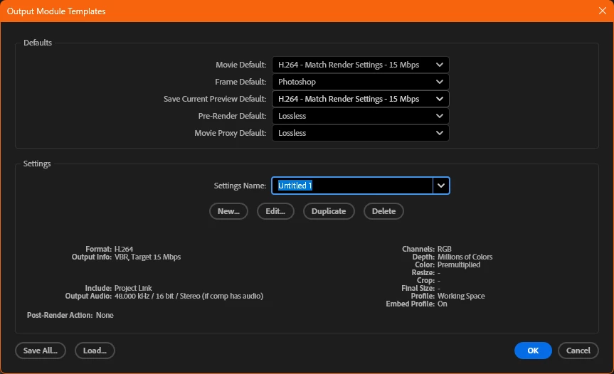 I believe it would be beneficial to have a “Save as Preset” or “Save as Output Module Template” button on the Output Module Settings page like Photoshop has on their “New Document” dialog box: