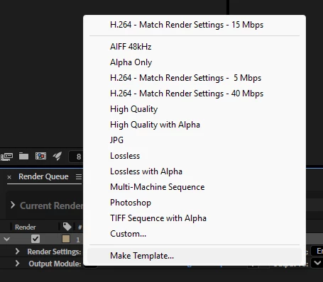 Currently, to create a “template” in Output Settings, you click the drop down next to the Output Module and select “Make Template...”