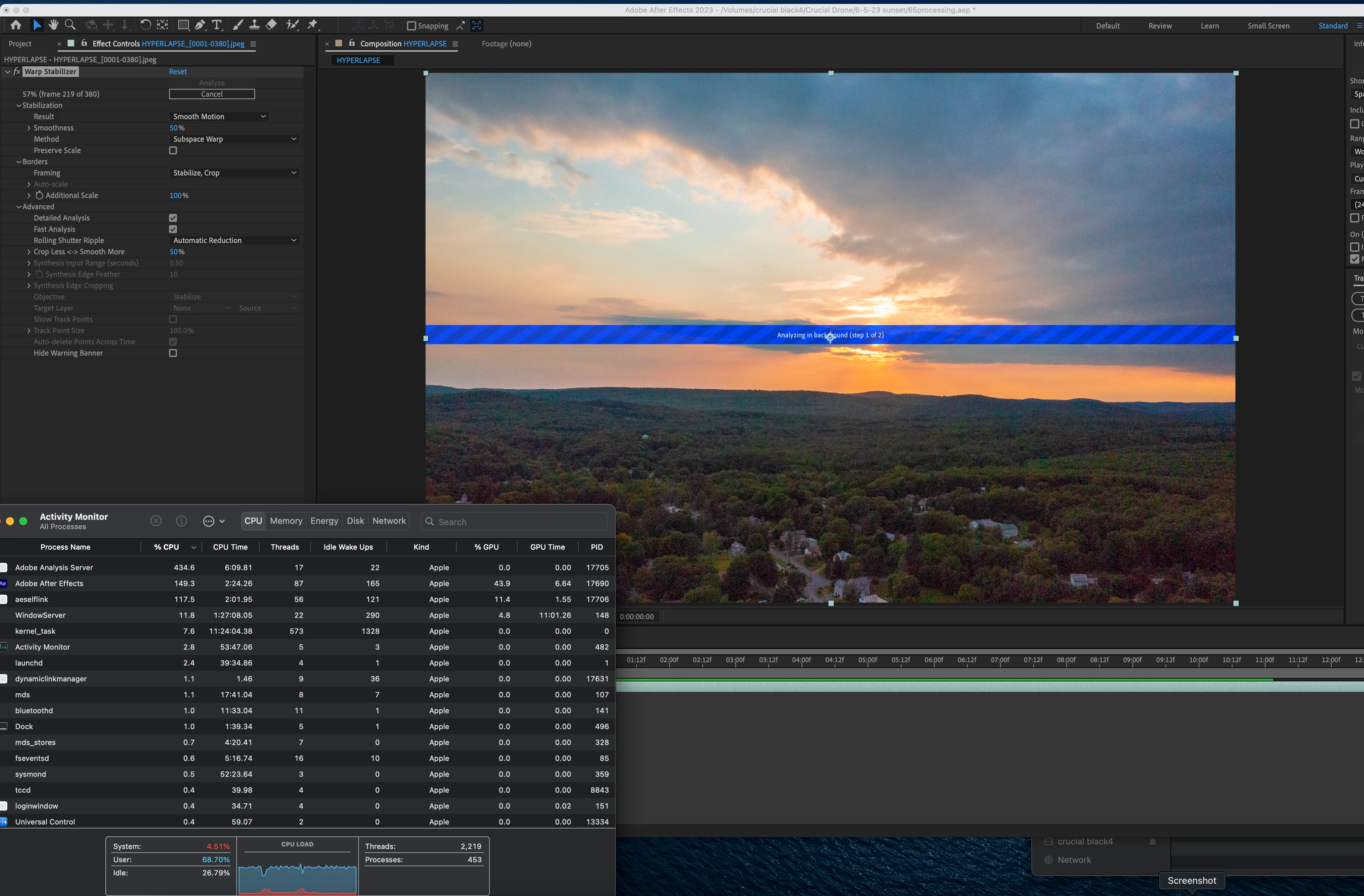 Warp stabilizer really should be utilizing the GPU during Analyze step. OS X ventura 12.4 Mac Mini M2 Pro 32GB. AE 23.4.0