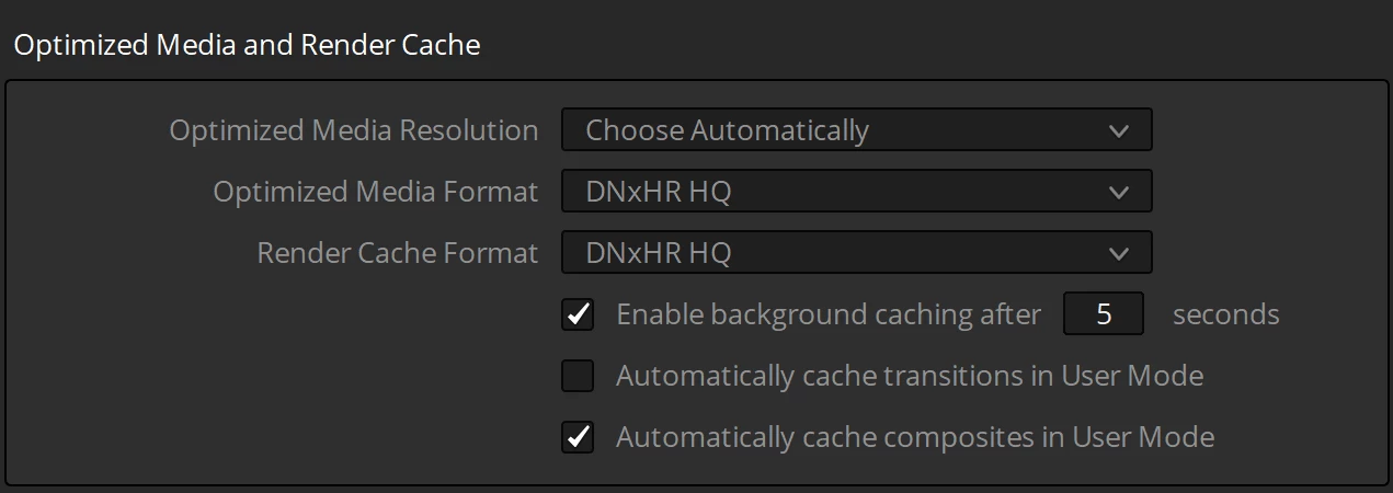 I get that 20 years ago hard drives weren't the quickest and there was a limited choice in codecs so it made sense to playback from RAM. But now we all have SSDs and DNxHR exists I don't get why AE has not been re-written to playback straight from a hard drive rather than moving it into RAM first. It would be great for AE to playback from disk with a choice of codec and bit depth dependent on a users needs and system capability, much in the way that Resolve does with smart cache (see pic). Uncompressed I gather would be a strain on most systems but this is overkill anyway, certainly for playback - I challenge anyone to point out any differences between uncompressed and DNxHR HQ and if people wanted to keep working uncompressed then the option could always be there to playback from RAM but for me and I would assume many others 10bit DNx would be fine. This will mean longer timelines and smoother playback as AE isn't having to move disk cache to RAM for stuff further up the timeline when playing back.