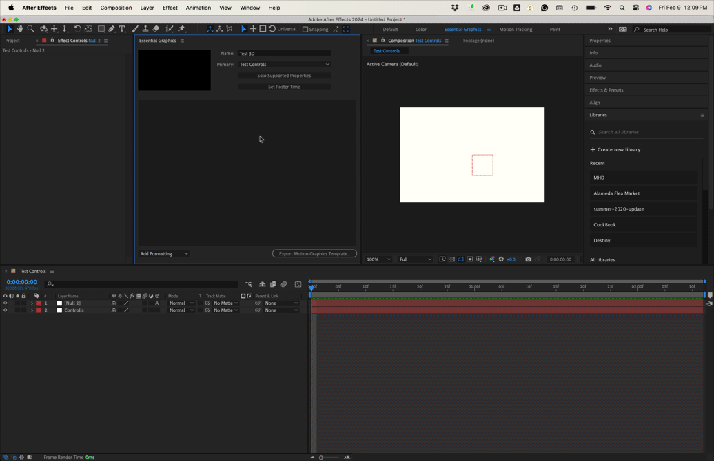 The Essential Graphics Panel and MOGRTs currently support Point Controls but do not support 3D Point Controls or 3D layer/Transform Position properties. This makes setting up animated 3D graphics incredibly difficult because you have to separate dimensions or add Expression Control/Sliders' to give the user access to those dimensions.