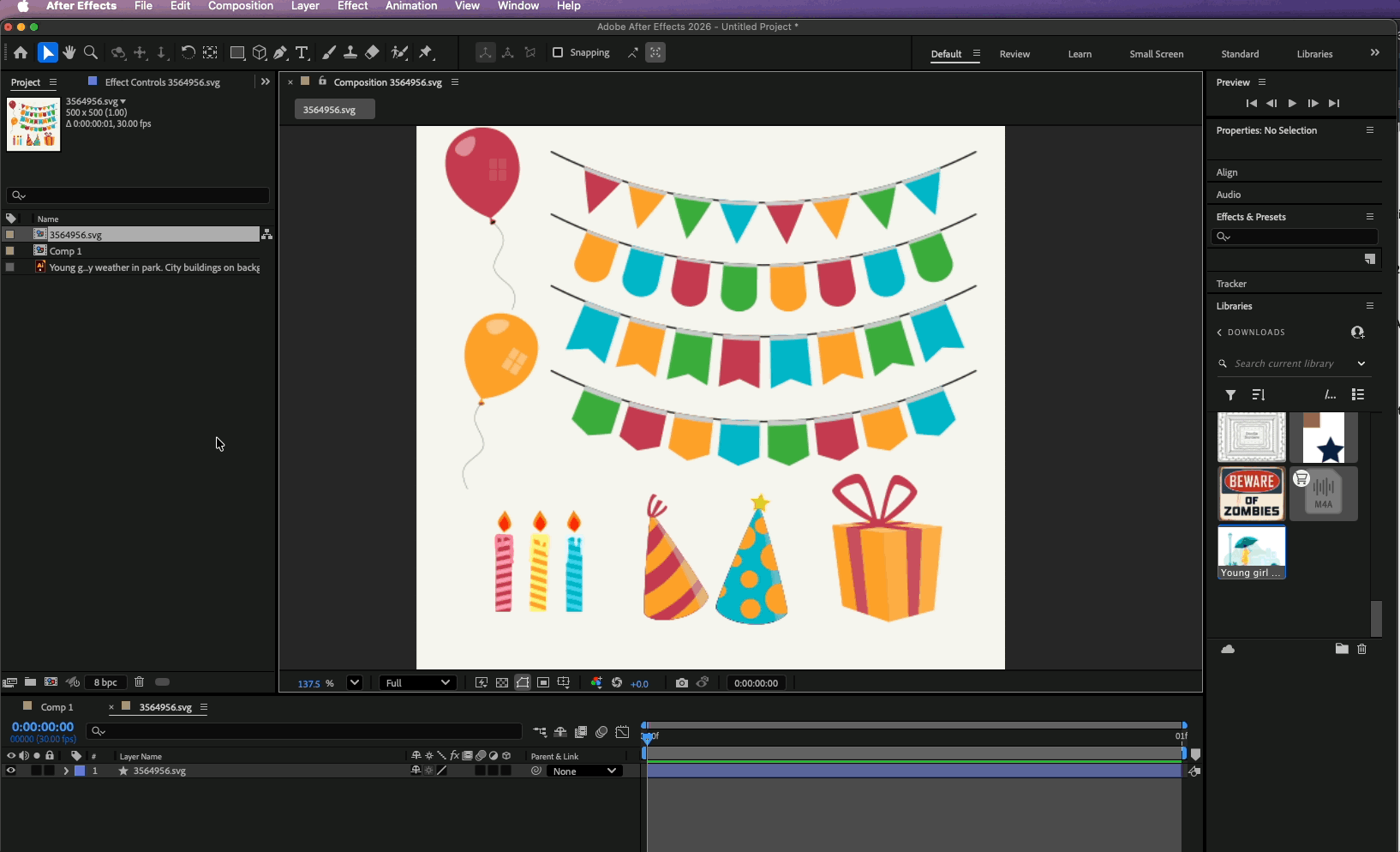 the svg imports as one frame long comp in 30fps.