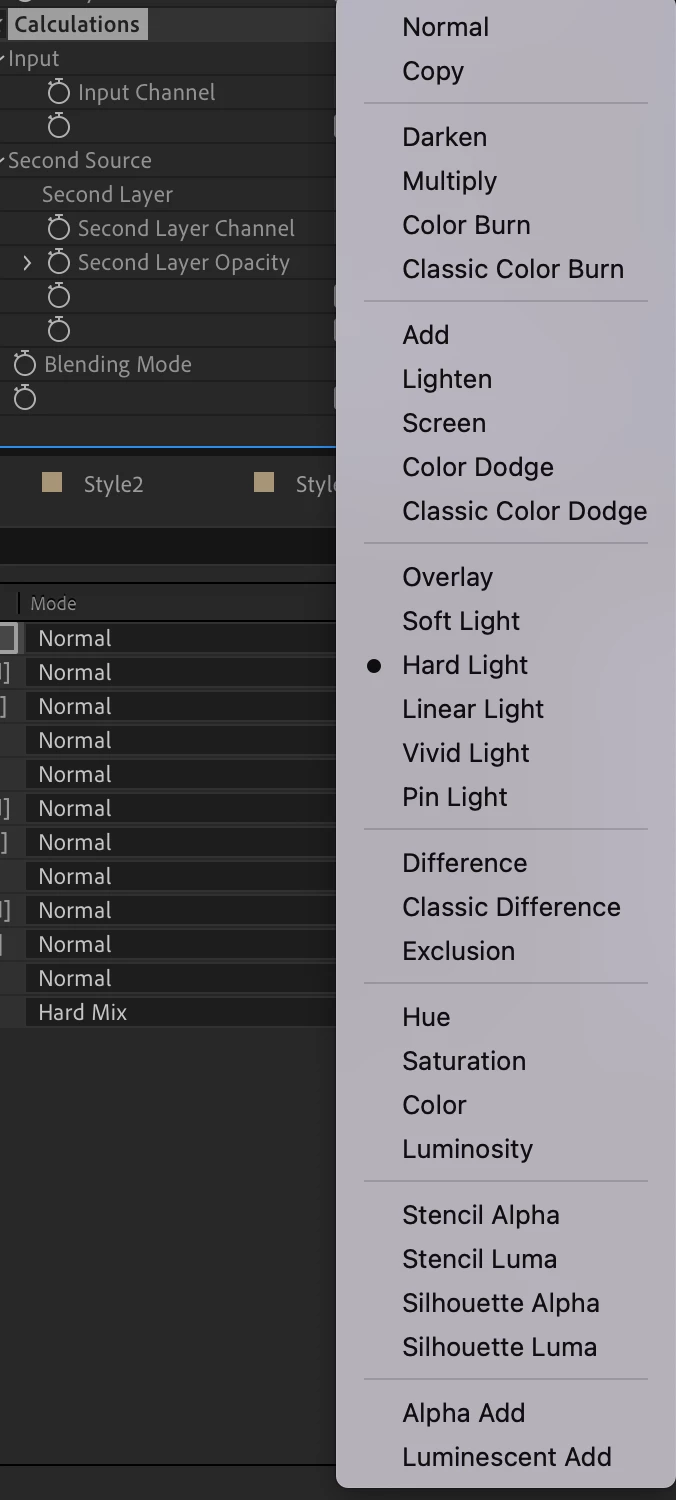 For an effect that I am building, I need to happen a lot of things in a single layer. That is where the Effect/Channel/Calculations comes in handy. But unfortunately, the Blending Modes this effect offers are not the same as those for Layers.