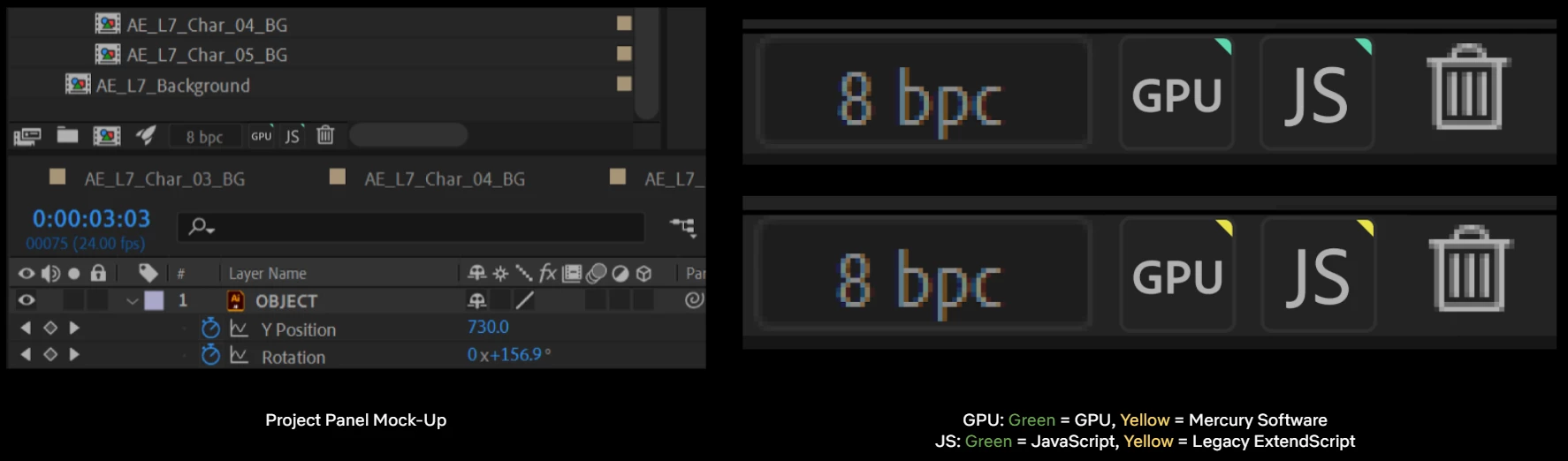 It's not readily apparent if GPU or the JavaScript Engine are enabled in a project, which can lead to slow performance and expression errors.  This is most relevant for users who forget to check their “Project Settings” upon inheriting a project file. This happens with team projects, where project files are passed around between multiple users and multiple machines.