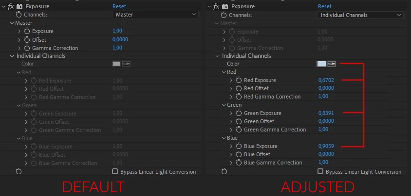 I mentioned it being unusable for linking to color control which is what I've been using Levels (individual controls) for. But ultimately it would be awesome if the Exposure effect could have a color picker as well! When relighting CG or whitebalancing a linear plate using a color control is tons easier than individual sliders. Having the exposure values be 1,0 on all channels makes 1,0 white no change and changing the colors would reflect back to those values which is why that change is neccesary.