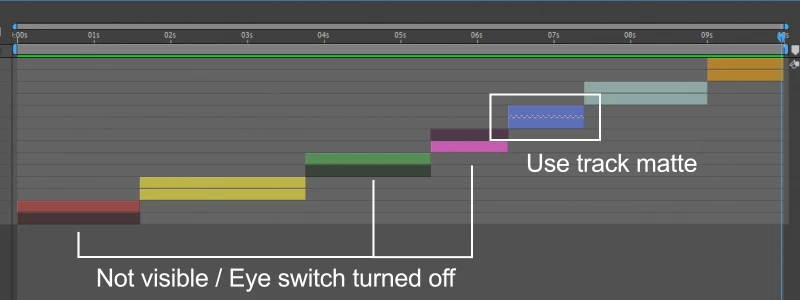 The other suggestion I have is for layers to have an indicator that they are using the layer above (or other layer) as a track matte. Again you can look to the left for the track matte window, but you can again select the wrong layer. Right now in the example everything is tidy and clean, but imagine you have 100+ layers that have random colors, different/overlapping durations... Its going to be a mess and such function will allow quick and accurate navigating without wasting time. Not to mention sometime your eye can't properly track which layer you need.