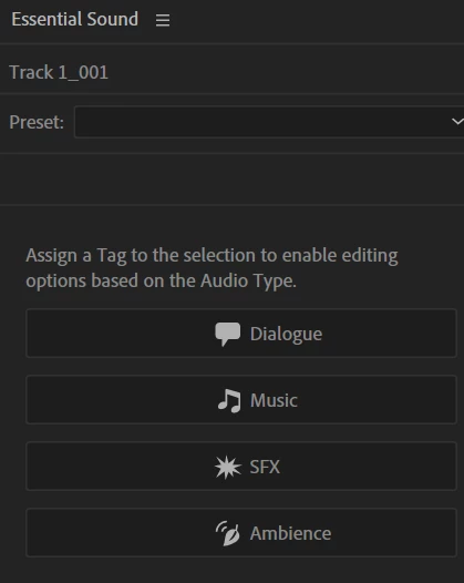 I use the Essential Sound audio types a lot in my workflow to mark clips for quick mass edits. Currently this involves moving my mouse back and forth from the Editor panel to the Essential Sound panel just so I can click a single button to assign the highlighted clip to the audio type I want. This would be vastly improved by custom keyboard shortcuts for assigning each audio type.