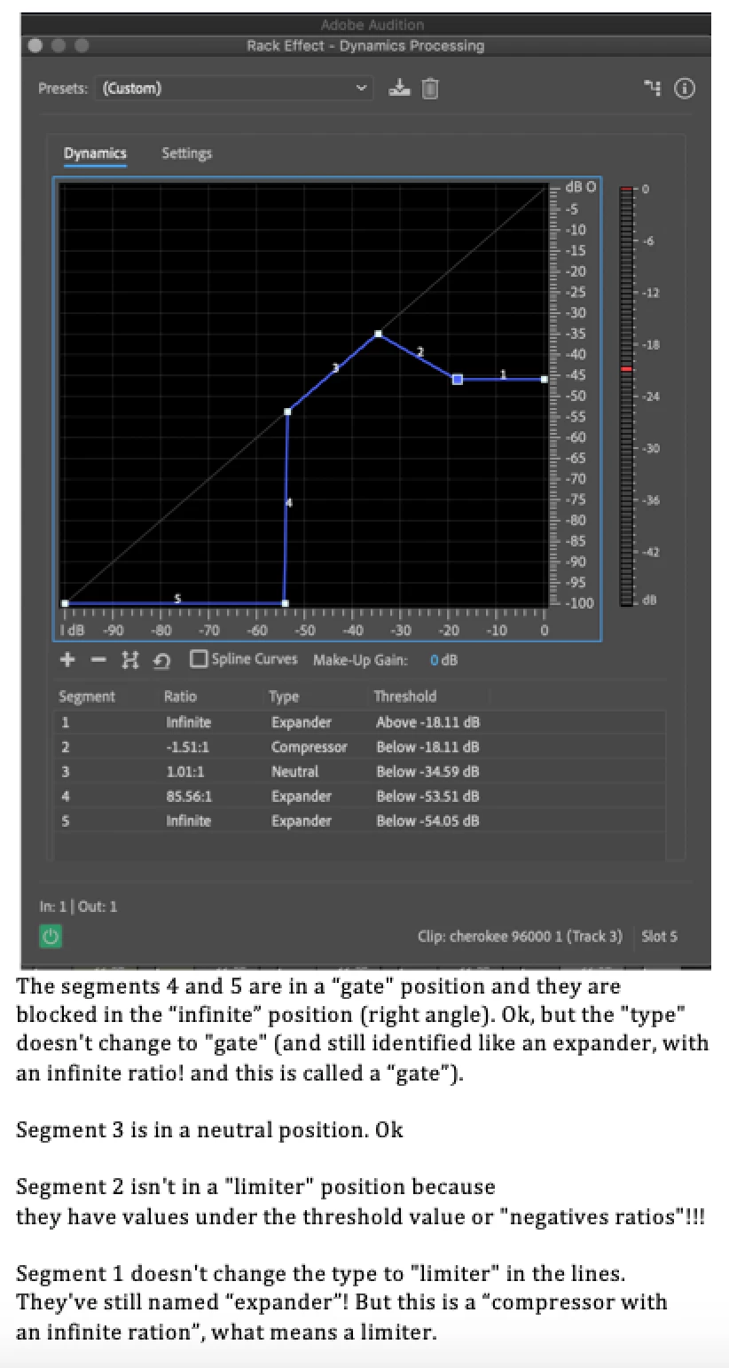 3) Improve some natives plugins from Audition. Like Dynamics Process, where the graphics points and the lines with the ratio and thresholds values are not linked. If I change the points on the graphic, this changes the number on the lines, but I can't make it in the inverse sense. The solution for this is maybe one or two lines of code, guys. And in the limiter position, the line in the graphic go under the threshold value and don't change the name to "limiter". The gate position is blocked in the threshold value, but maybe to change the name to "gate" in the line. Please, take a look to the file here up-loaded.