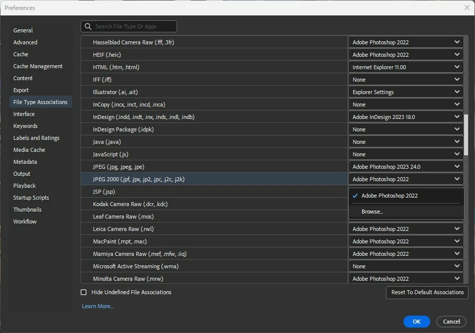Why doesn't Photoshop 2023 now appear when I click the drop-down on the a File Type that I want to change. That would be *far* quicker. Or can there be an option to select multiple File Types and do a bulk update?