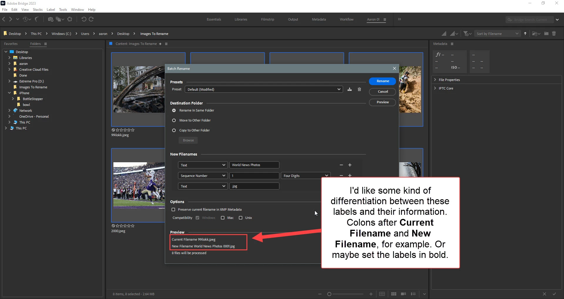 FFeedbackCommunityMemberInspiringForum|Forum|7 months agoSeptember 16, 2025Open for VotingImprove U.I. labels in Batch RenameForum|Forum|7 months agoSeptember 16, 20251 reply0 viewsIn the Batch Rename user interface, it is difficult to read the Current Filename and New Filename because there is no differentiation between the label and the text.Perhaps put colons after the labels, or set them in bold?File Operations