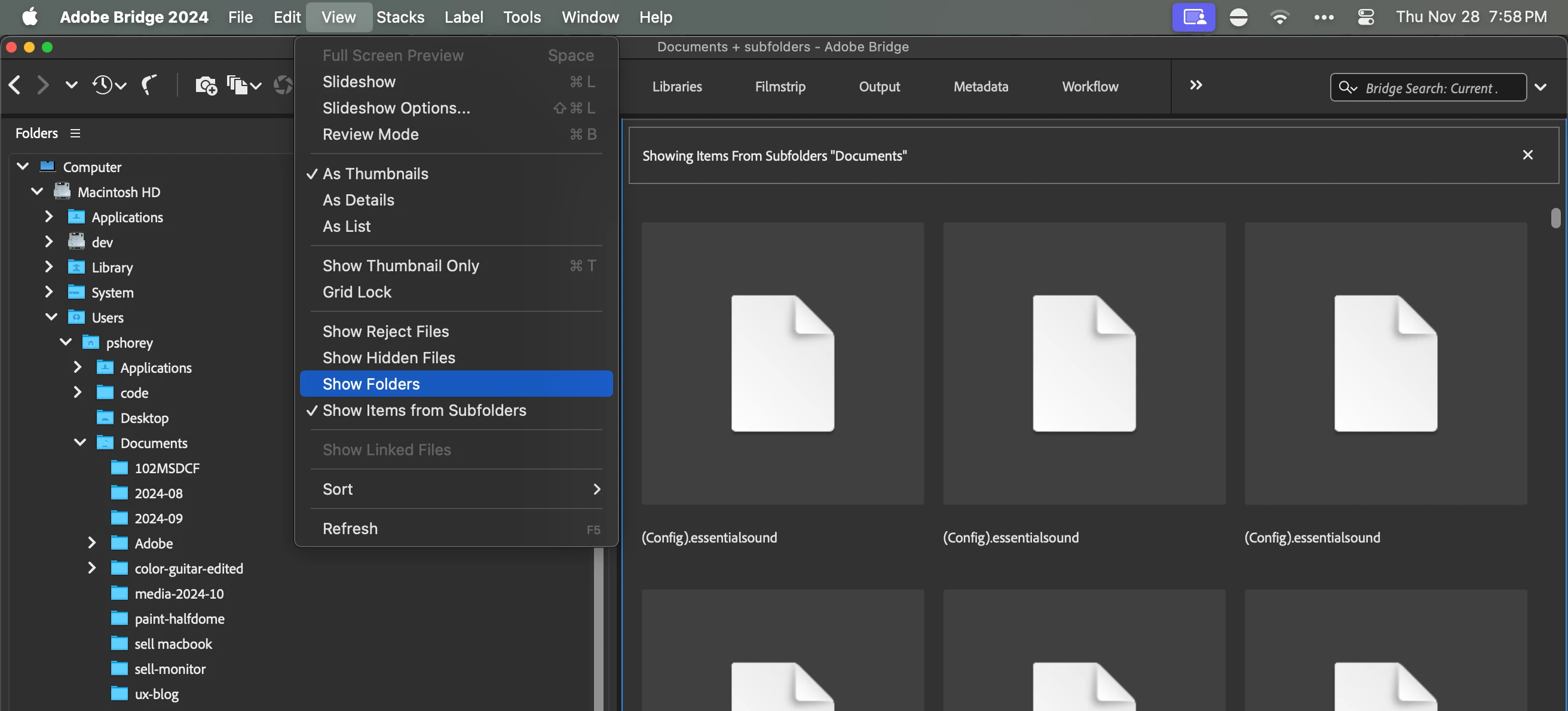 Would be very useful to show only specific types of files in the current view, to see only photos (which I might edit in Photoshop) or videos (which I might edit in other Adobe programs) or other Adobe related media. Instead, I see a lot of random system files and documents which I do not care to edit in Adobe programs. They only get in the way, prevent me from seeing all my images and videos and other media. I only want to see in Bridge files that I might want to edit using Adobe apps. Most folders on a computer are not just images. I like to use Bridge as a file explorer, as an alternative to Finder or Windows Explorer. It's better! It could be much better! Again, persist this preferences not just for the current folder but for all opened folders.