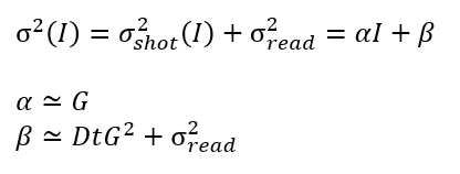 The noise power is therefore often considered to be growing linearly with the brightness, with a slope and intercept alpha and beta, dependant on the ISO, exposure and camera. Alpha and Beta are called "noise profile" and are expected to be found in one tag of the .dng files. They are not estimated from these equations but rather from noise estimation methods.
