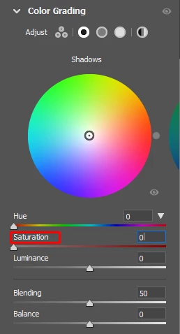 Add negative (-100) Saturation values in the Grading panel to desaturate just the highlights or shadows.